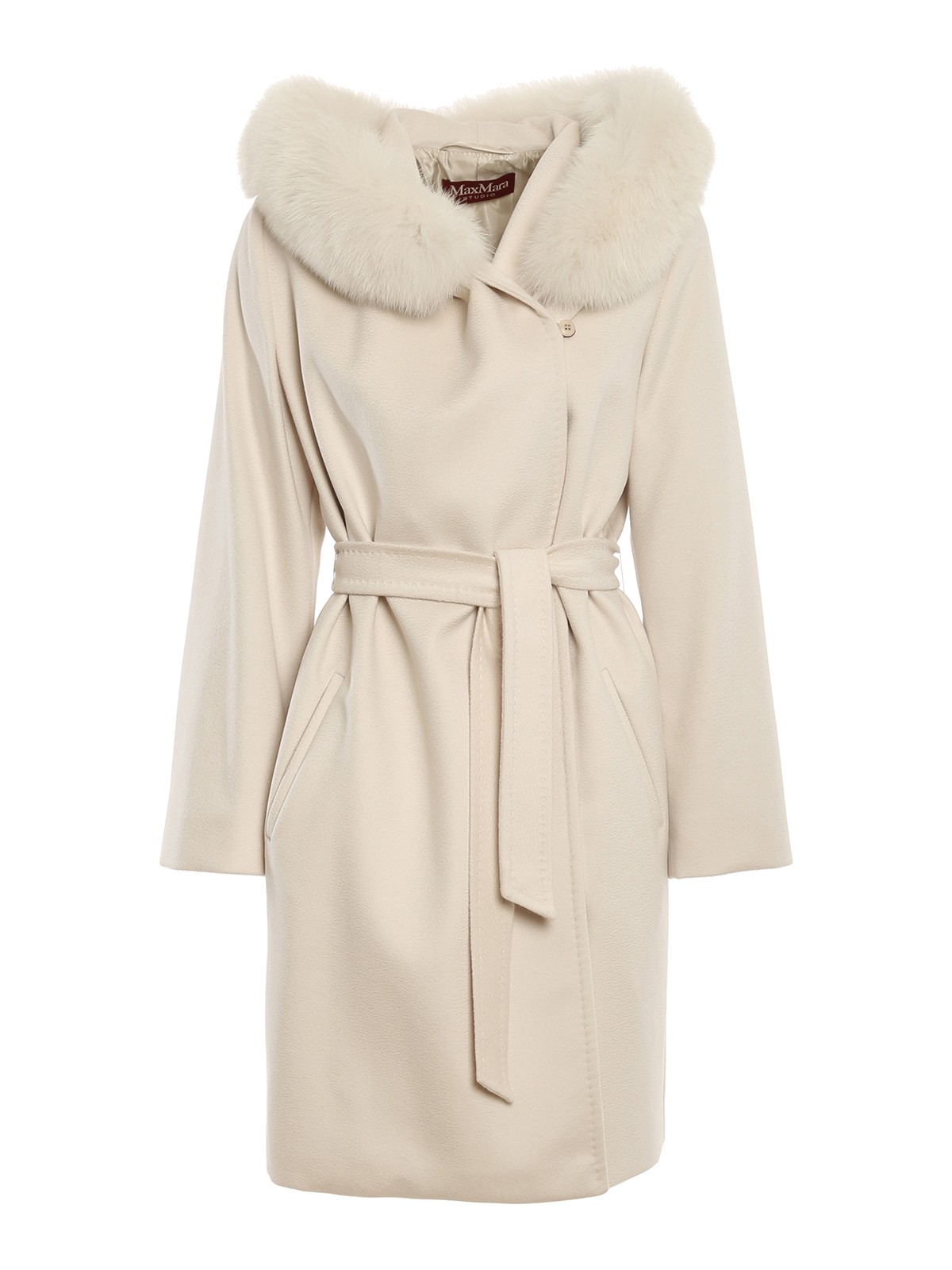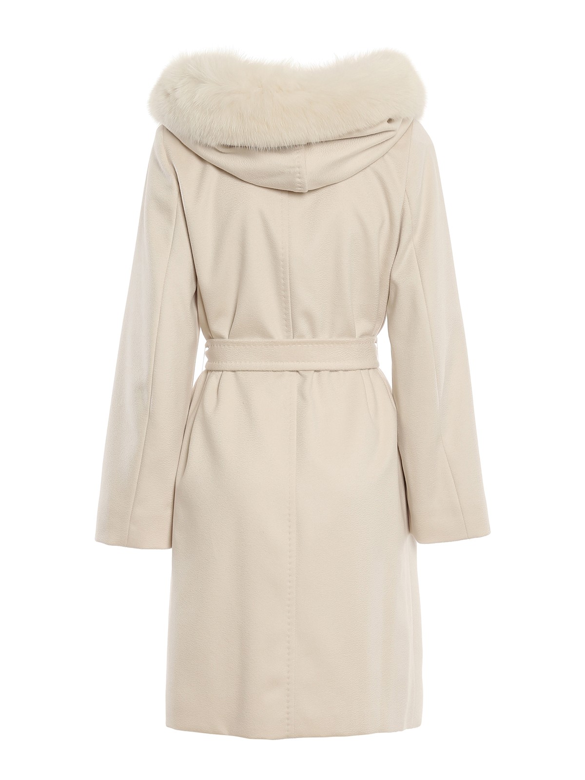 Virgin wool coat detailed with fur at hood, wrap closure with inner bow and single button, welt pockets and stitched profiles.