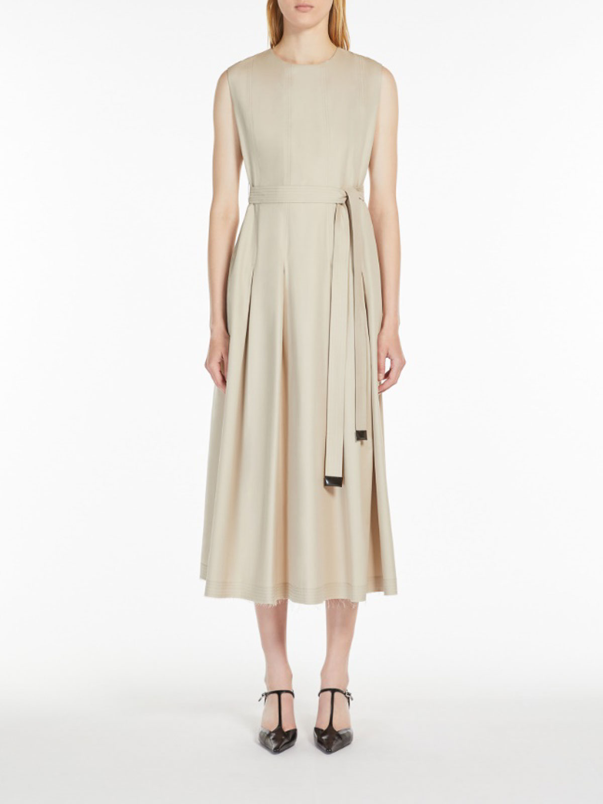 Sleeveless dress in pure washed twill featuring a pleated pattern in the center and back which highlights the silhouette and gives to the garment finished with topstitching at the bottom of the garment inset pockets on the sides and a matching belt to highlight the waist invisible zip on the back