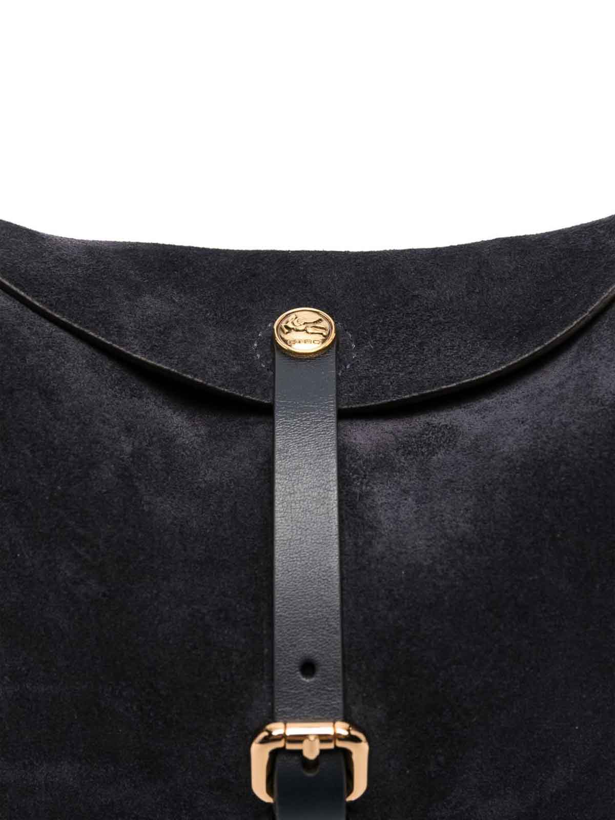Soft-lined pony bag made of solid-color suede with smooth leather interior. it features a double closure: the main one with a magnetic button decorated with the etro and pegasus logo engraved with the same technique as coin minting, and the secondary one with a functional metal buckle. the model includes interchangeable handle and shoulder strap with paisley detail at the snap hooks. magnetic and buckle closure internal wall pocket interchangeable handle and shoulder strap gold-finish metal accessories