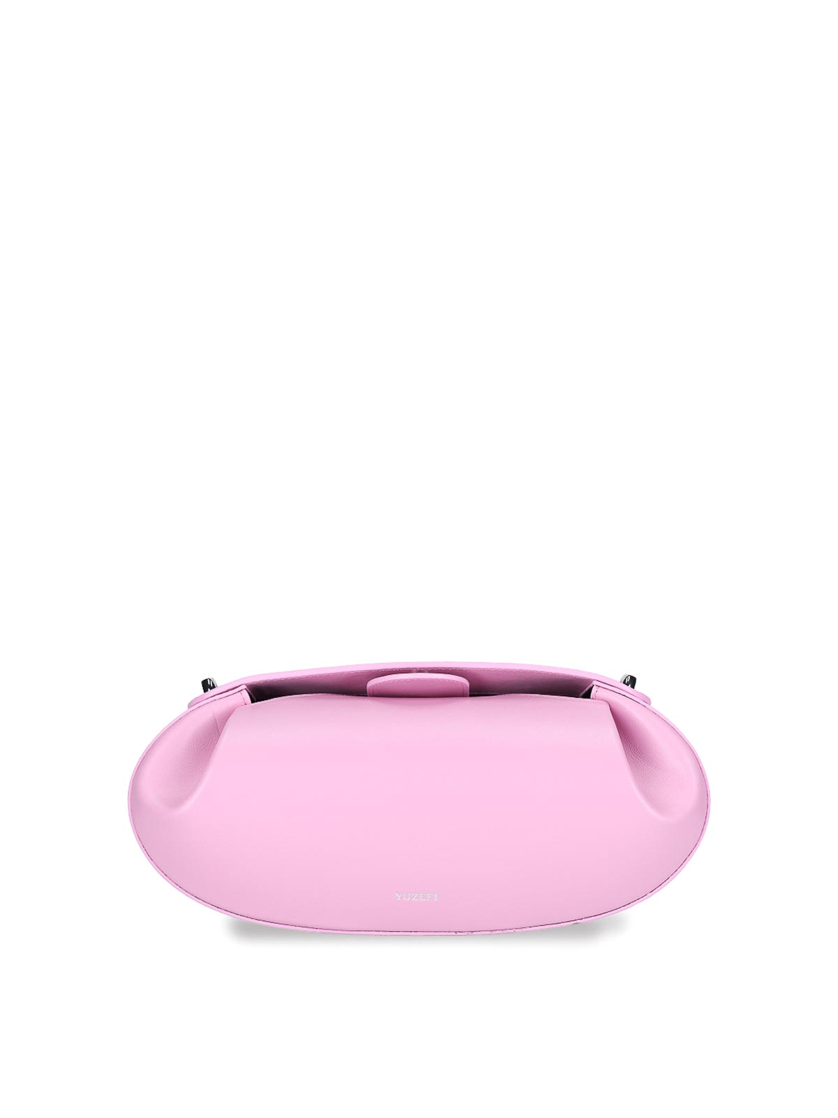 Pink yuzefi baton medium bag magnetic button one adjustable and removable one in chain lettering silver logo front one main compartment