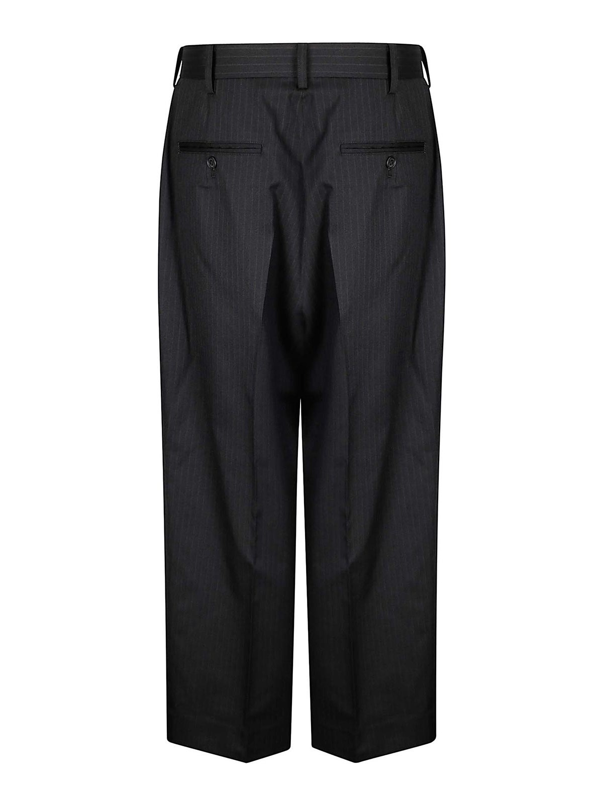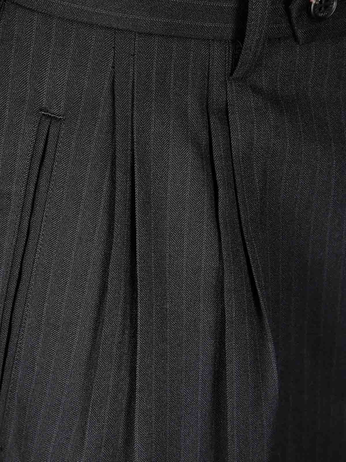 Wide leg pinstriped trousers with stripe, two welt pockets, two back welt pockets with buttons, pleats.