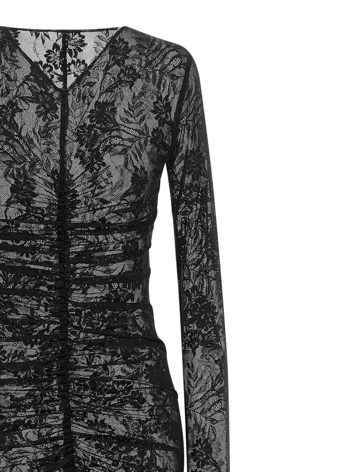 Long stretch dress in semi-transparent lace, v-neck, front curls, long sleeves, mermaid hem with train.