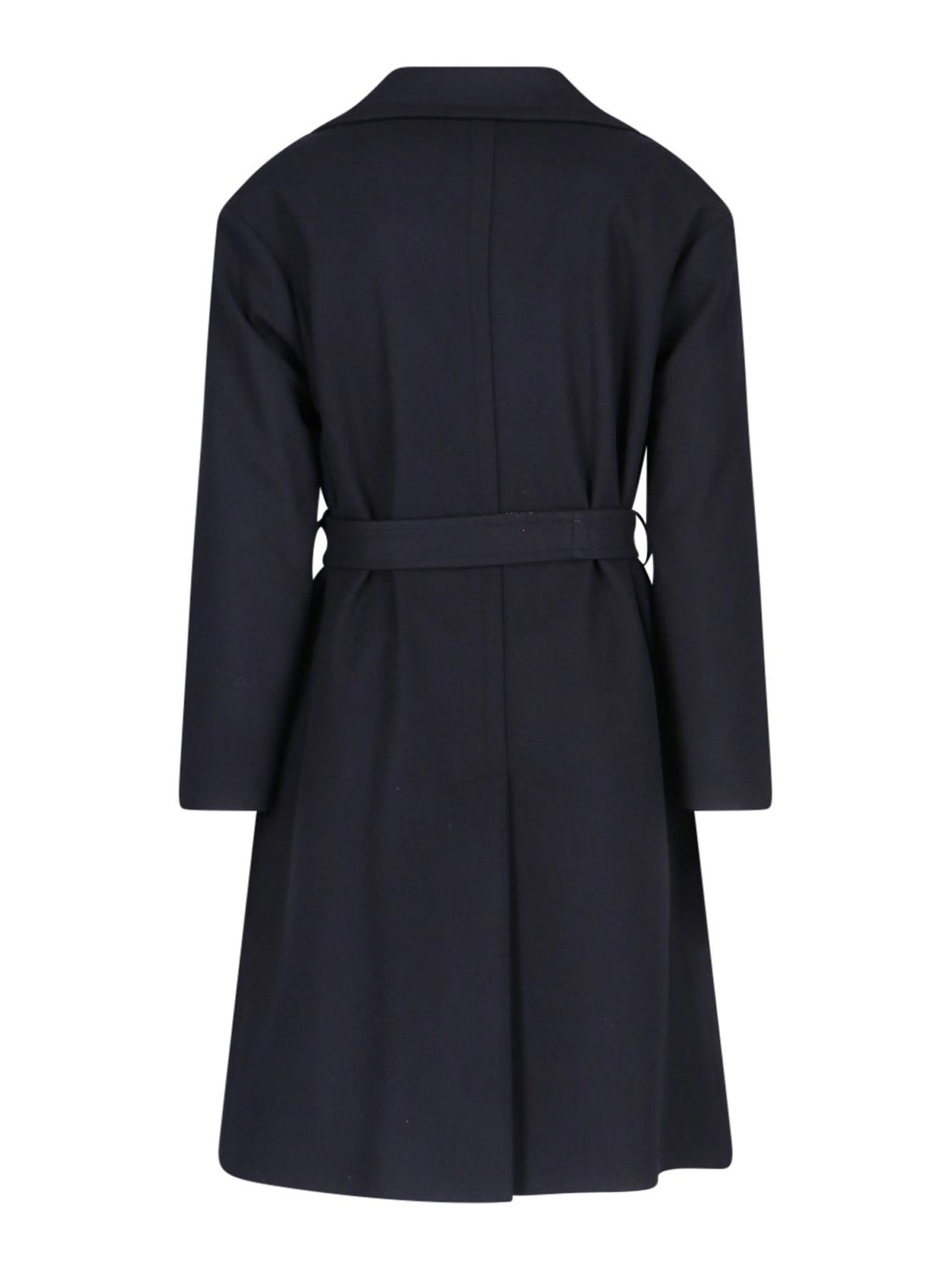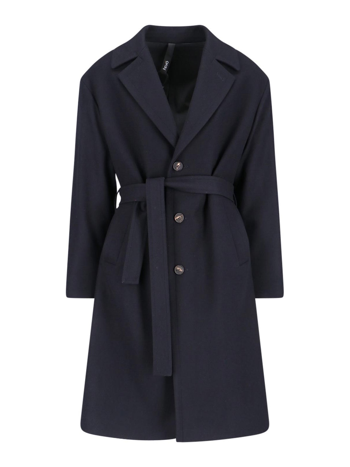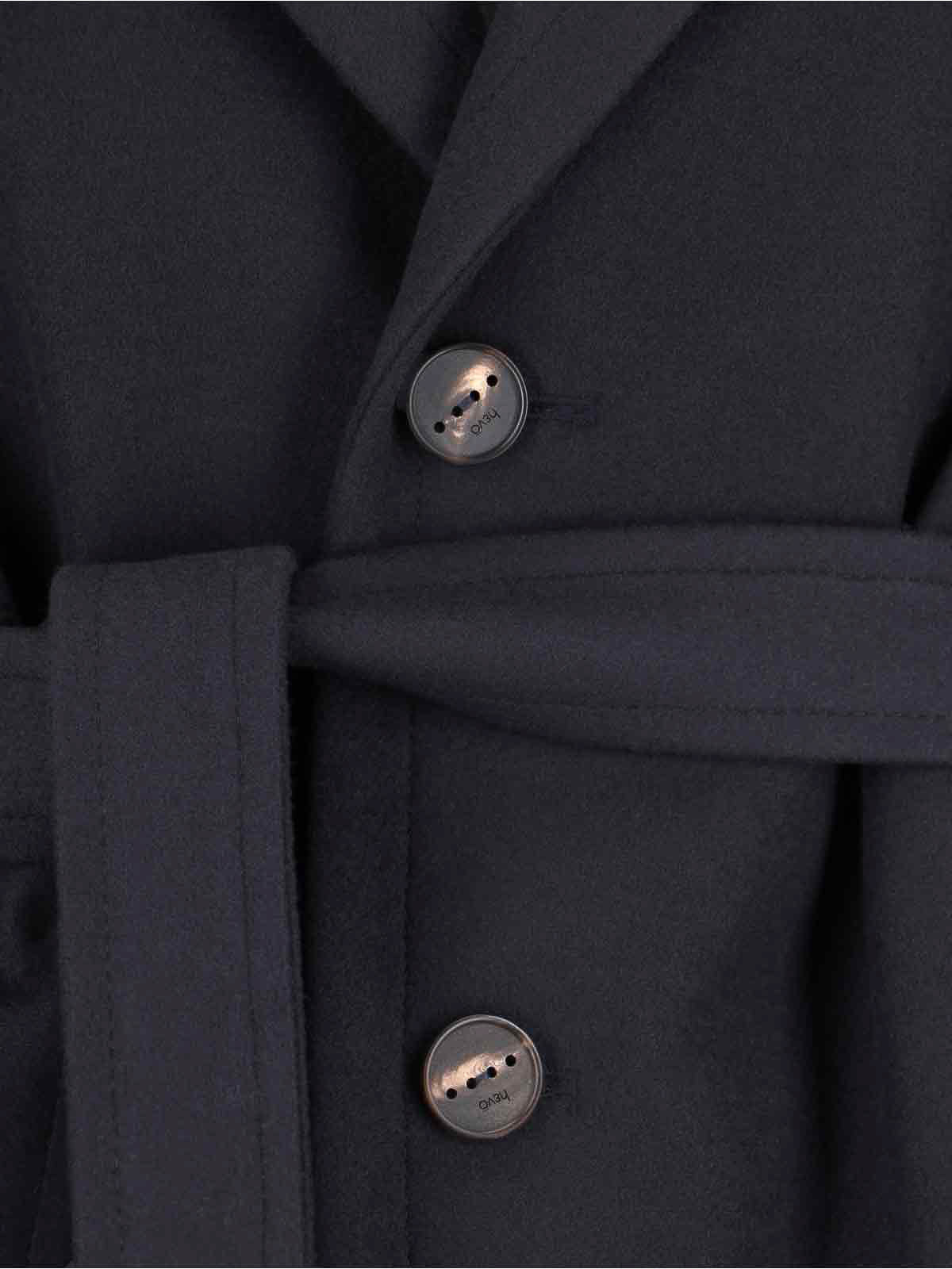 Ostuni hev midi coat in navy blue blend single-breasted peak lapels buttons tone-on-tone removable belt at the waist two side pockets deep central vent on the back straight hem