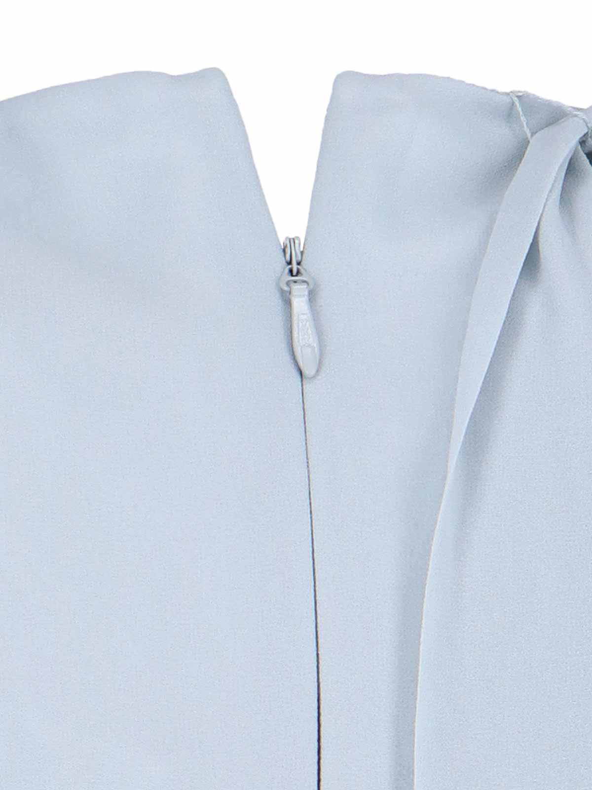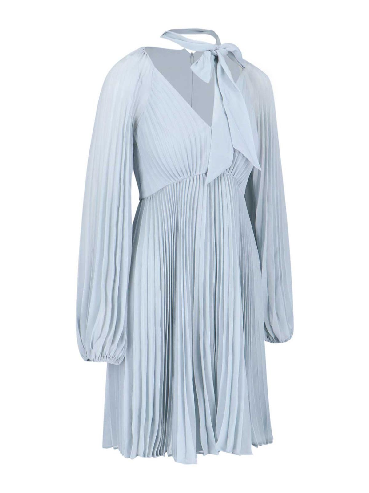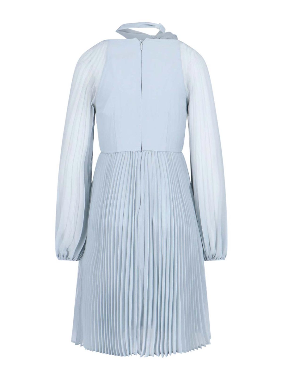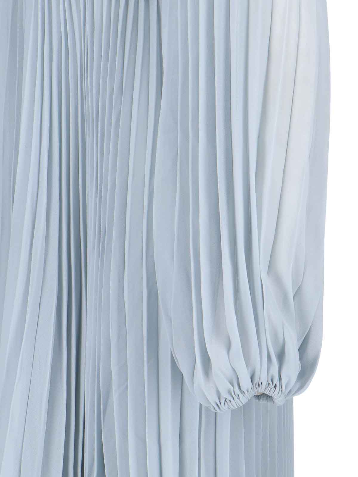 Zimmermann sunray pleated midi dress, made with recycled materials, light blue v-neck tone-on-tone scarf back zip long balloon sleeves with elasticated cuffs flared skirt straight hem