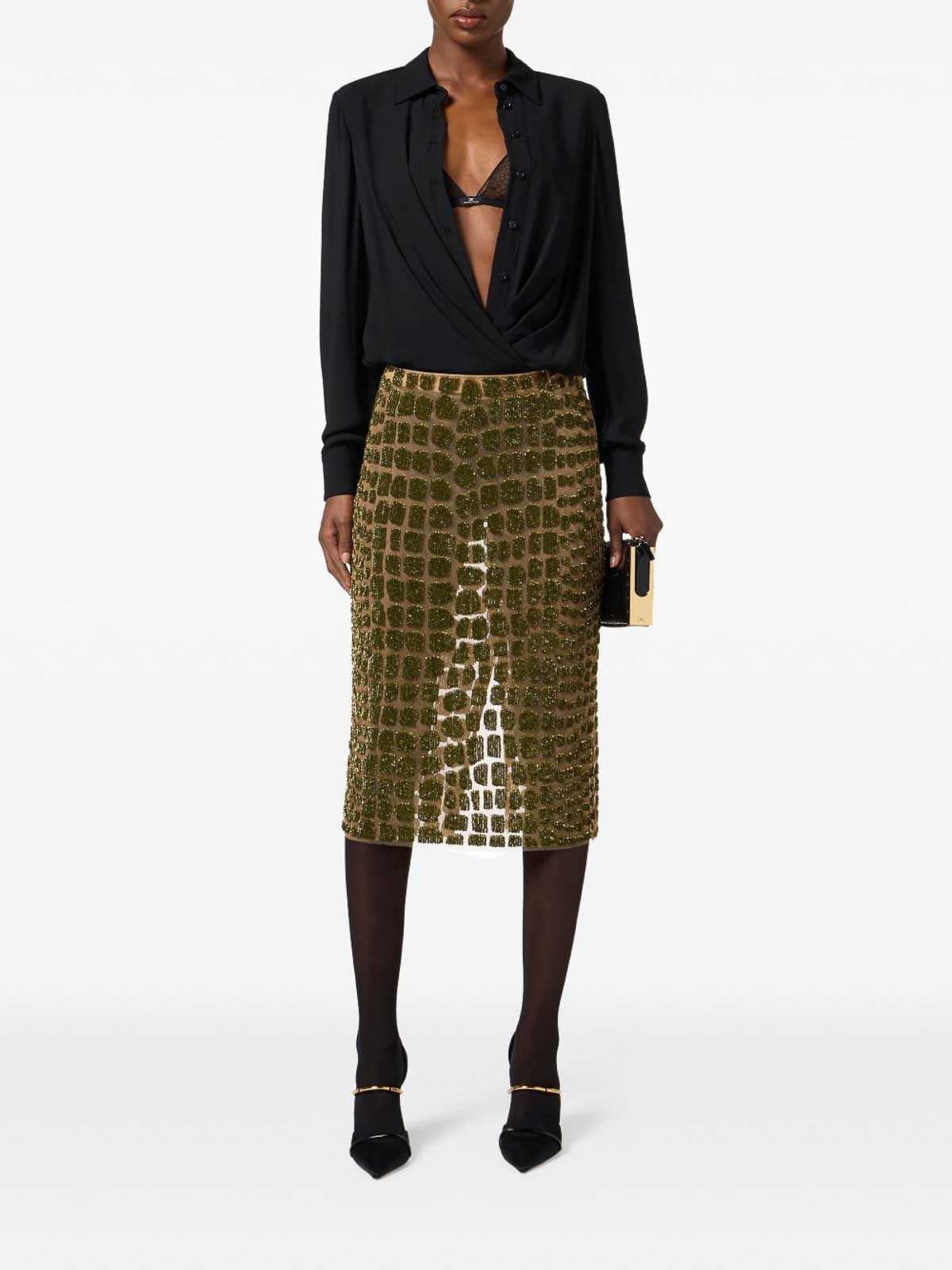 Embellished midi skirt color: green crocodile effect beaded decoration midi length