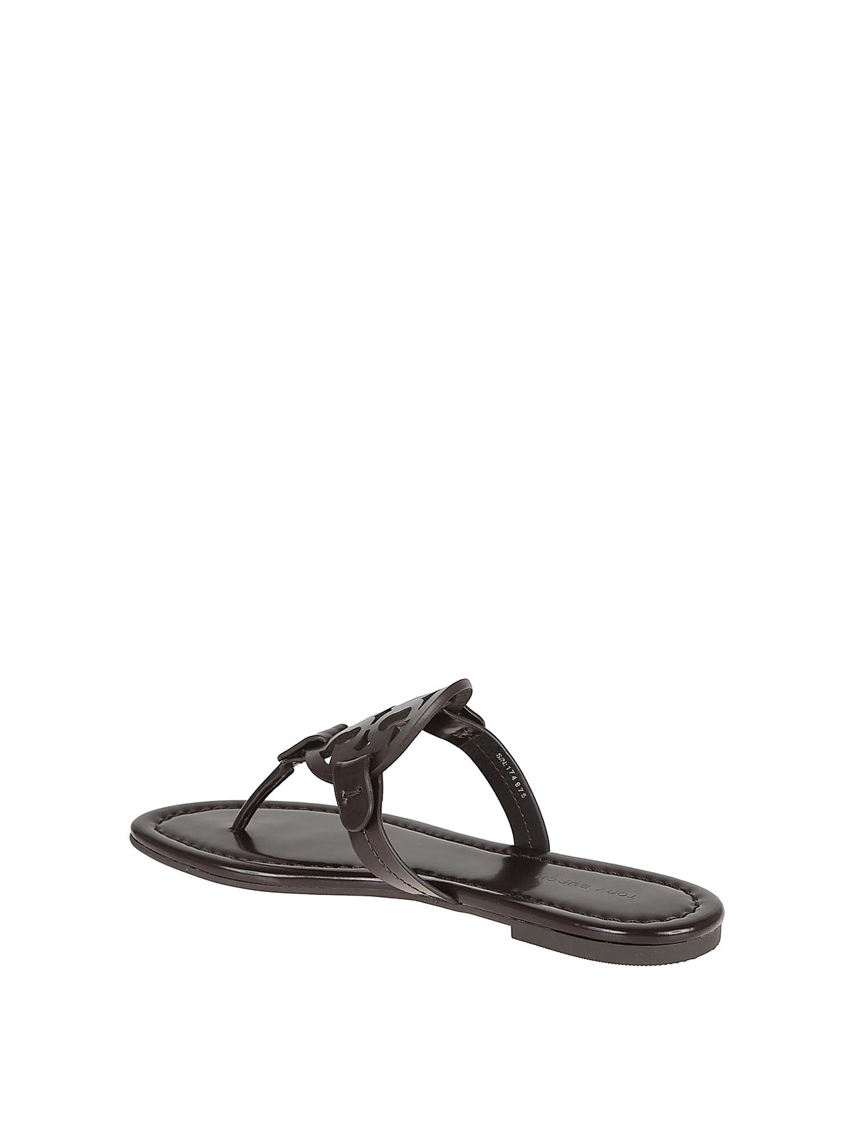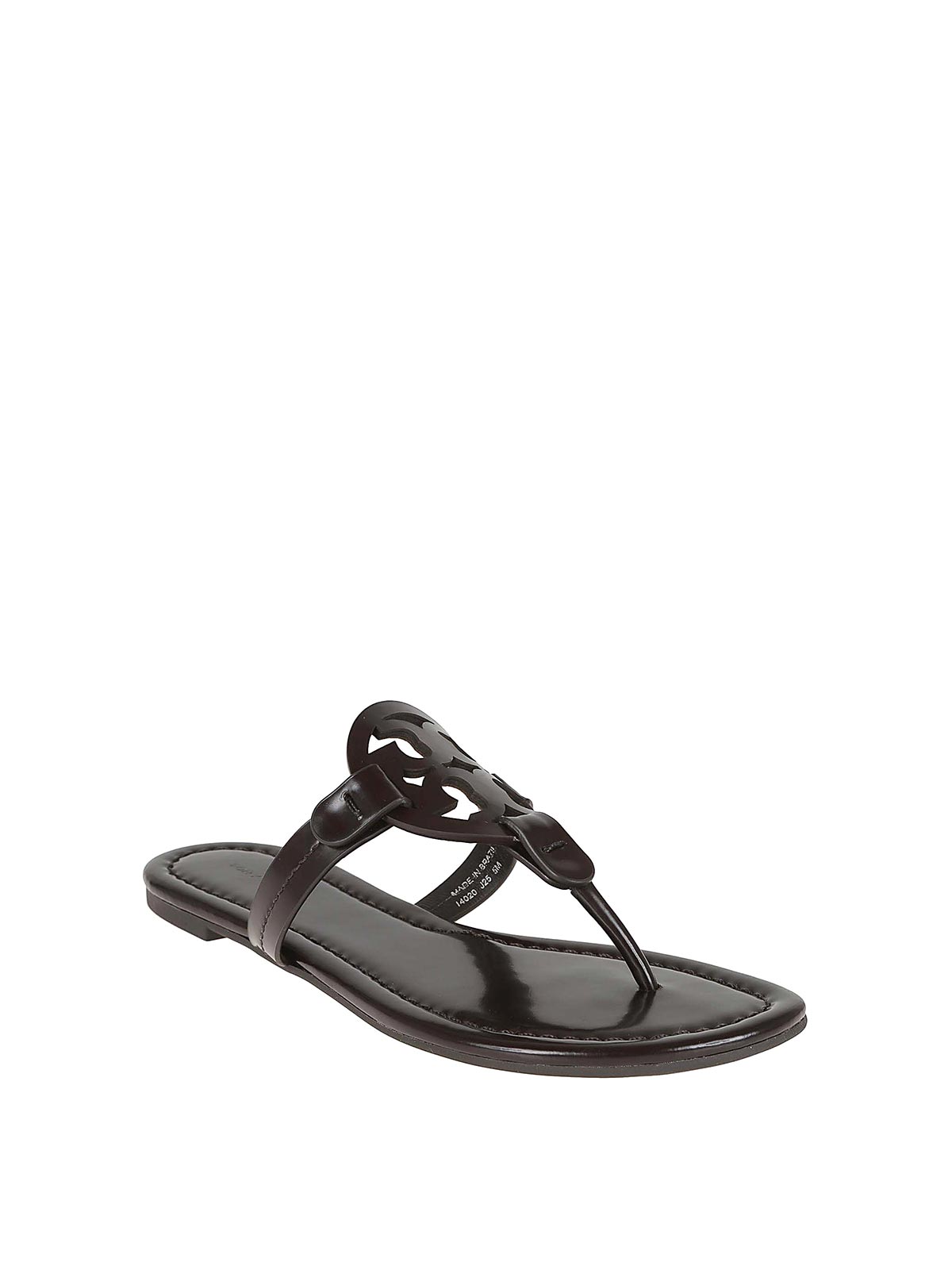 Tory Burch leather Miller sandal. Lightly padded insole, flexible rubber sole. featuring a laser cut logo with hand painted edges.
