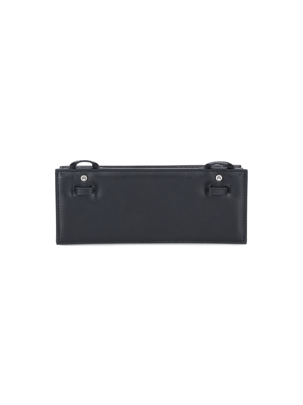 Adjustable black accordion y project mini bag with white logo print front upper zip one main compartment
