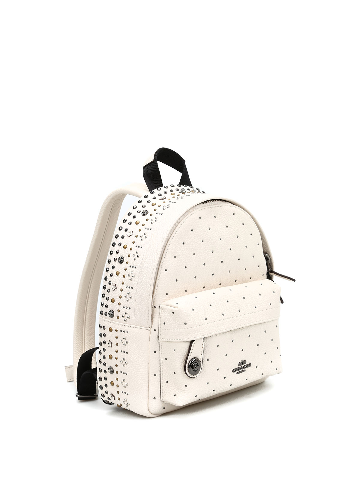 Grained leather small backpack featuring all over studs, an outer zipped pocket, top handle, two adjustable shoulder straps, zip closure, an inner open pocket and a zipped one, signature fabric lining.