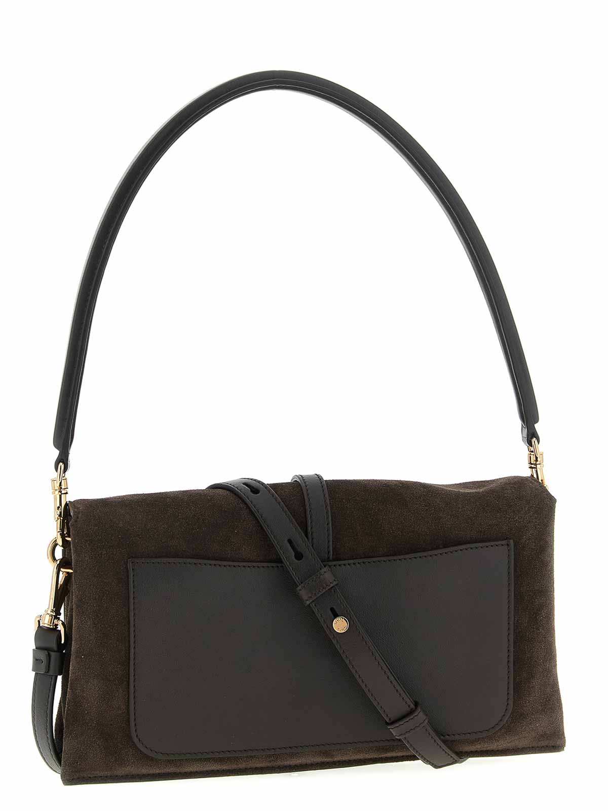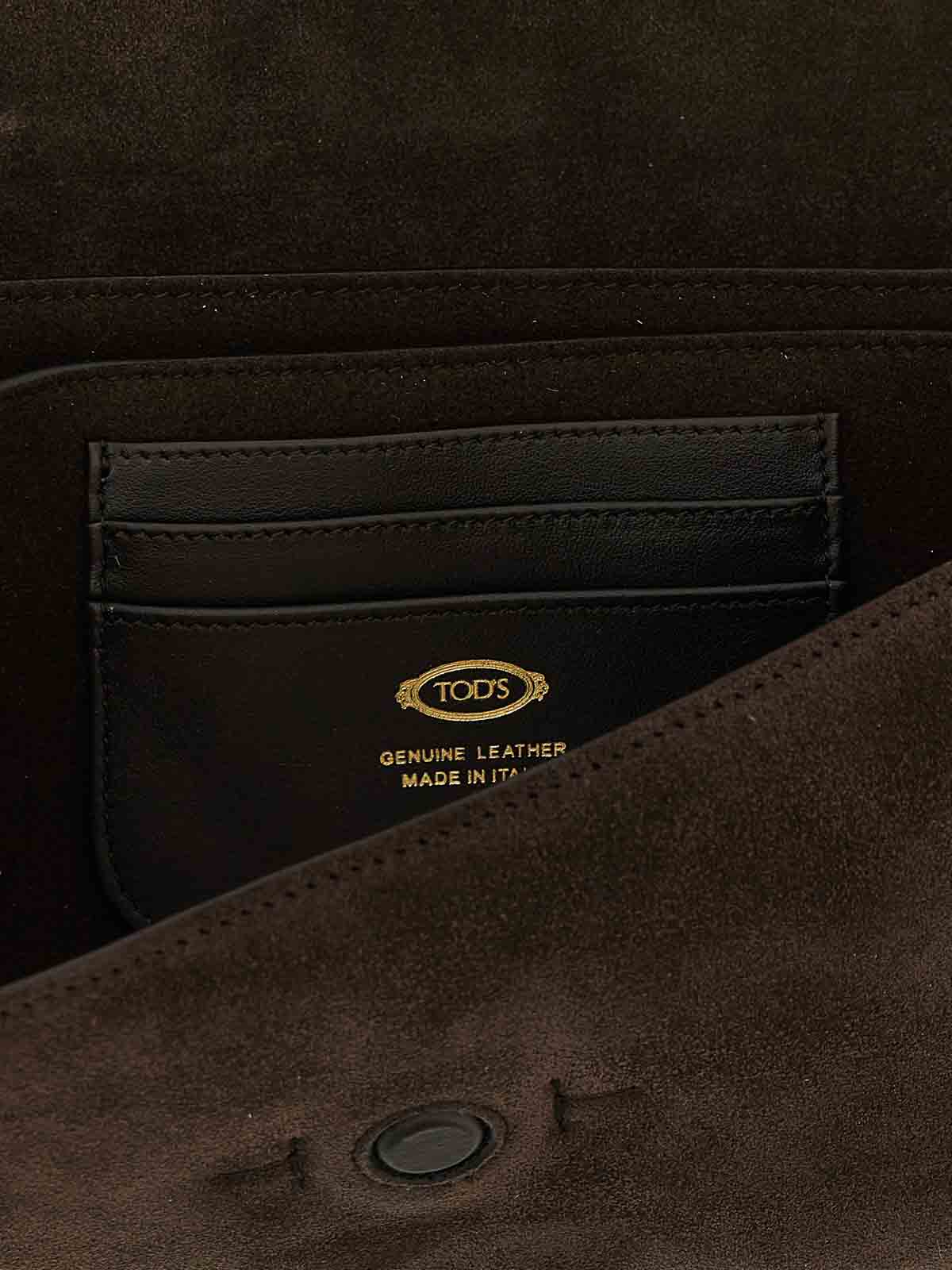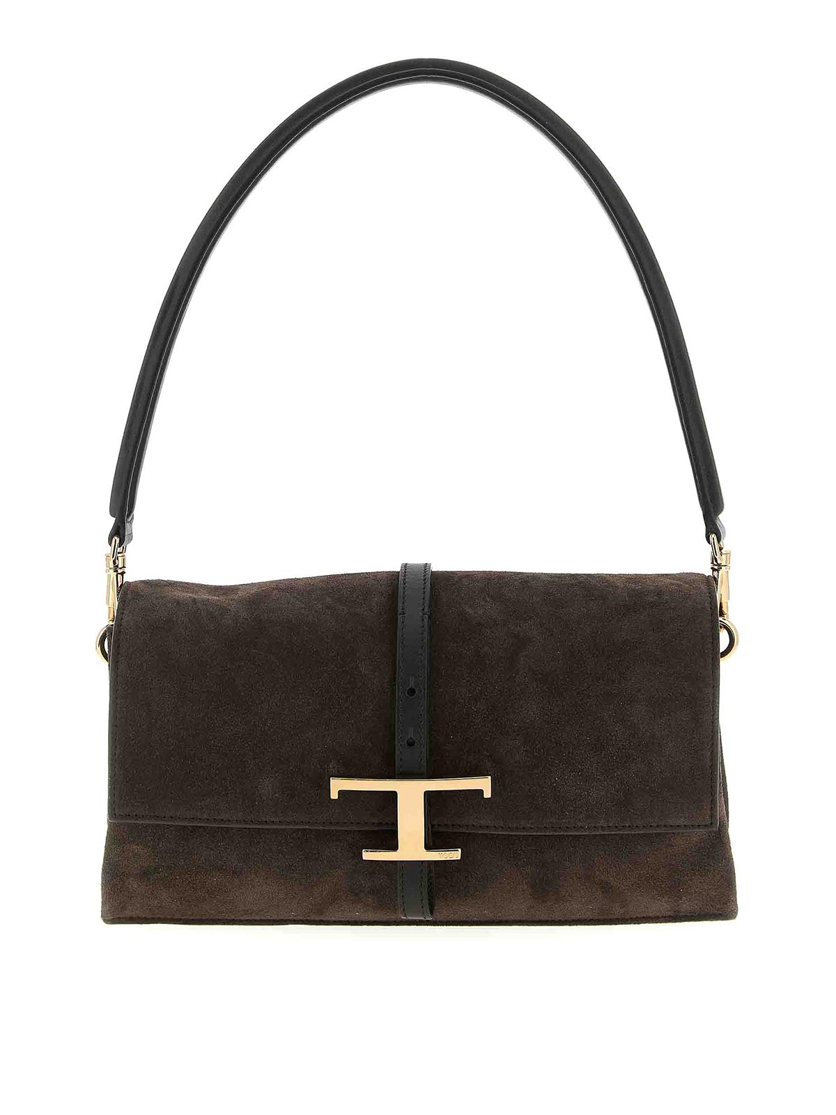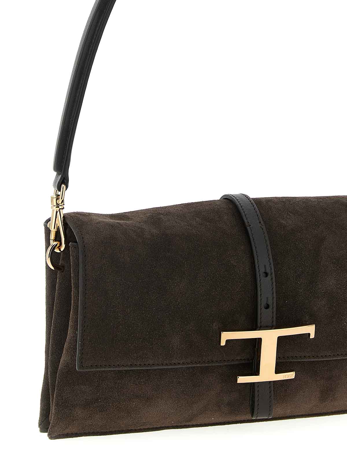 Mini shoulder bag in suede and leather with three bellows, magnetic flap closure with metal 't timeless' logo on the front, back pocket, removable handle, adjustable and removable shoulder strap.