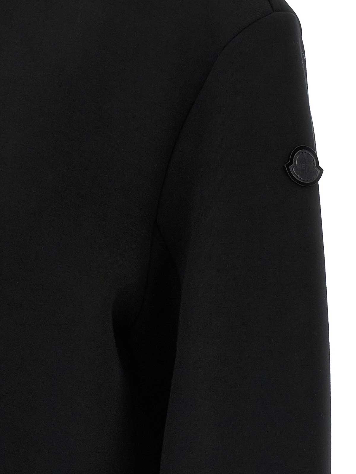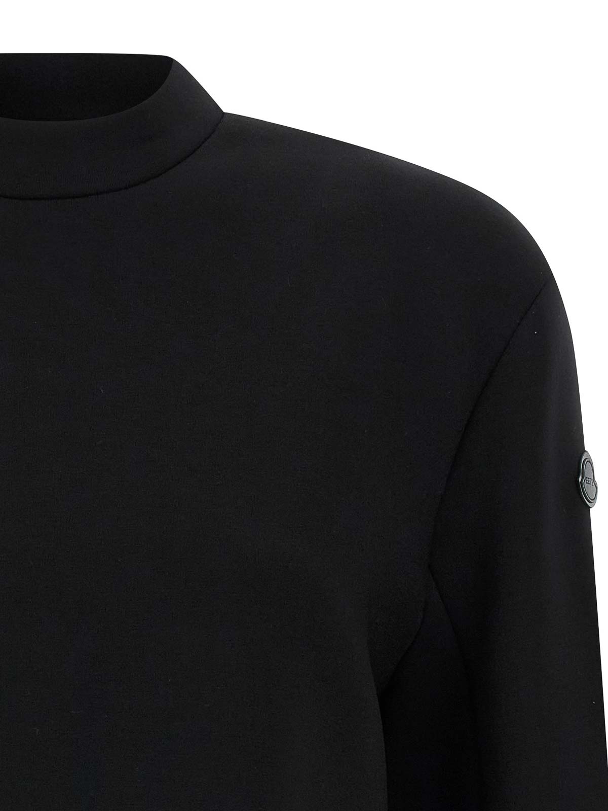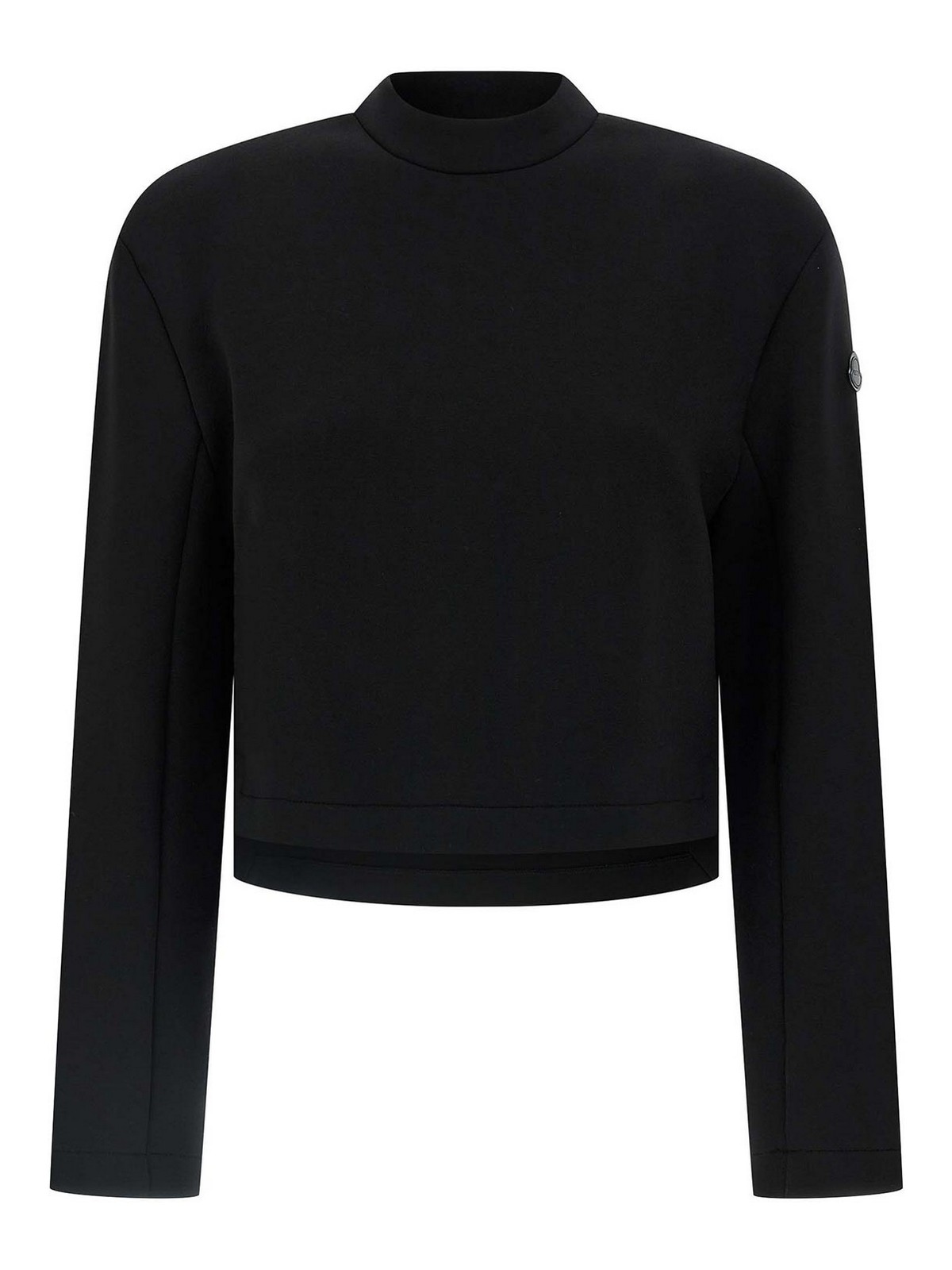 Moncler x edward enninful sweatshirt in scuba-effect fabric, crop model, high neck, long sleeves with cuffs and tone-on-tone logo patch applied, side slits, and asymmetrical hem.