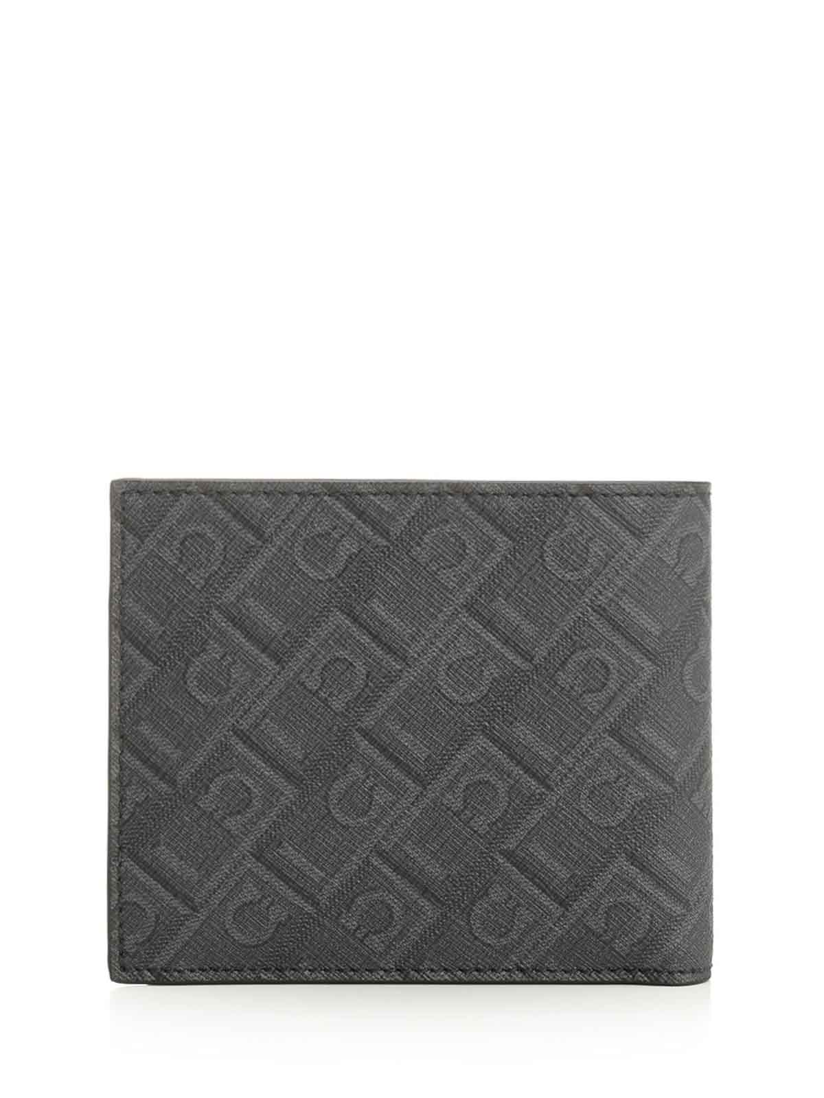 ferragamo monogram wallet in hammered calfskin and coated fabric printed with the ferragamo monogram, with compartments, flat pockets, slots and a coin pocket with a button.