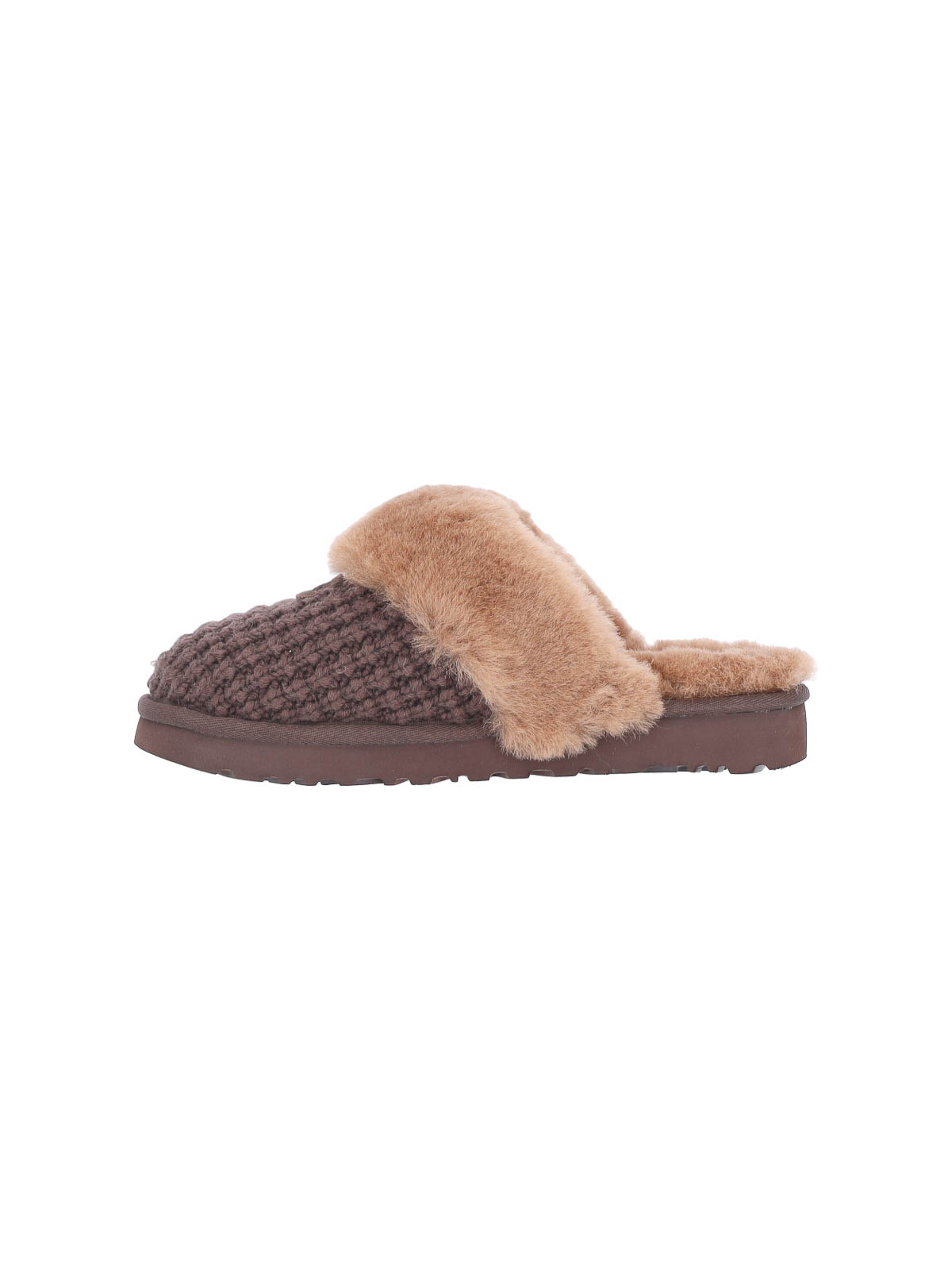 cozy ugg mules in brown knit, closed round toe, slip-on fit in beige sheepskin, logo label applied on the front, responsible for sugar