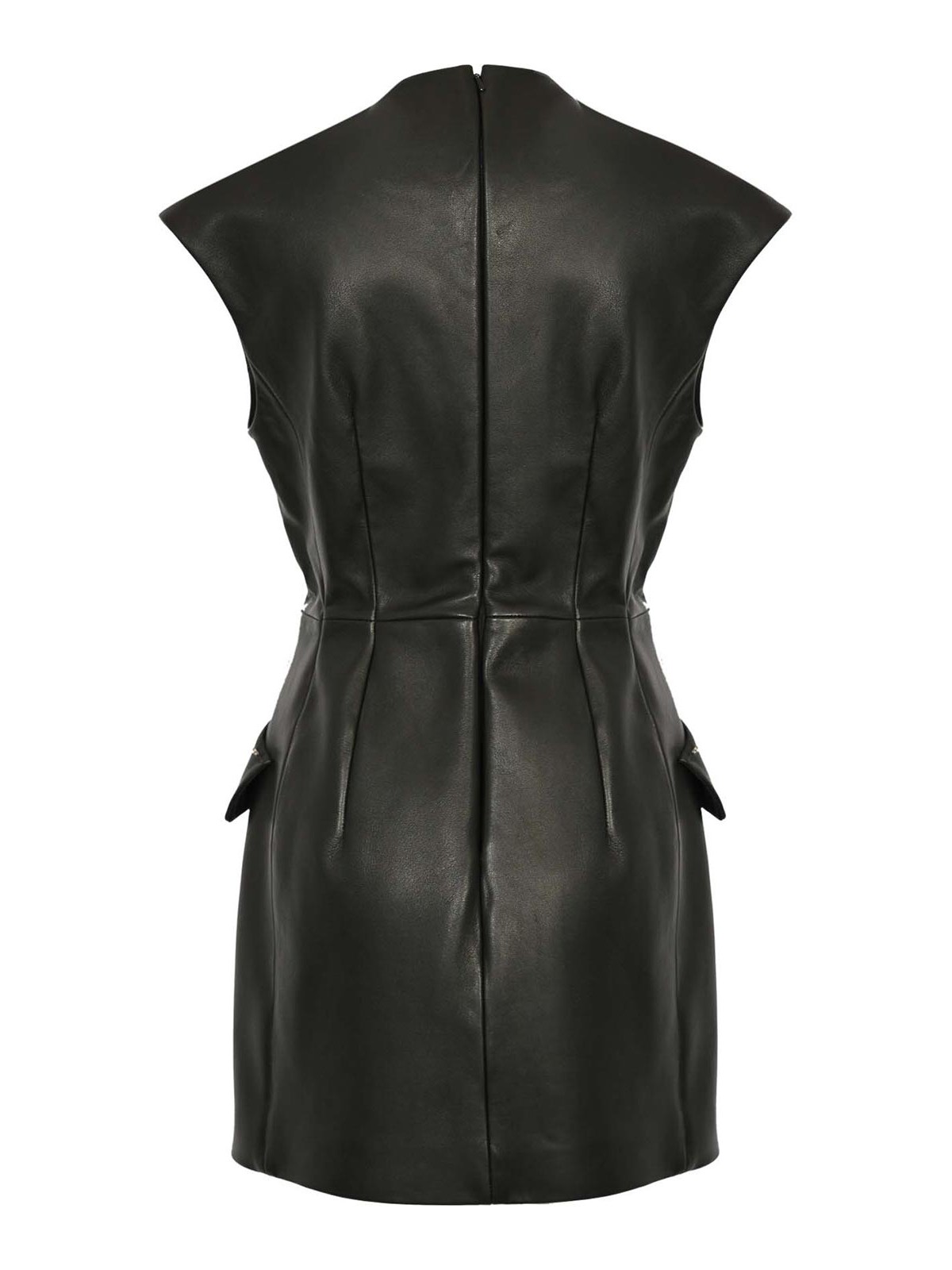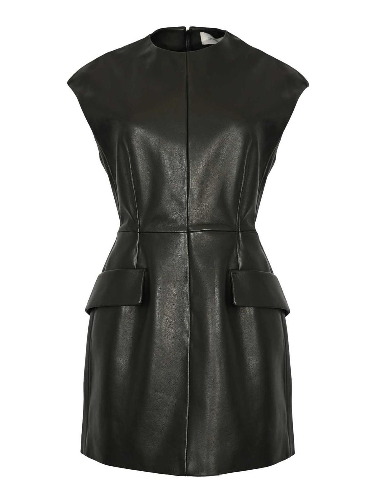 leather mini dress: soft nappa leather crew neck short cap sleeves fitted waist darts and shaped sides side flaps back zip closure slim fit