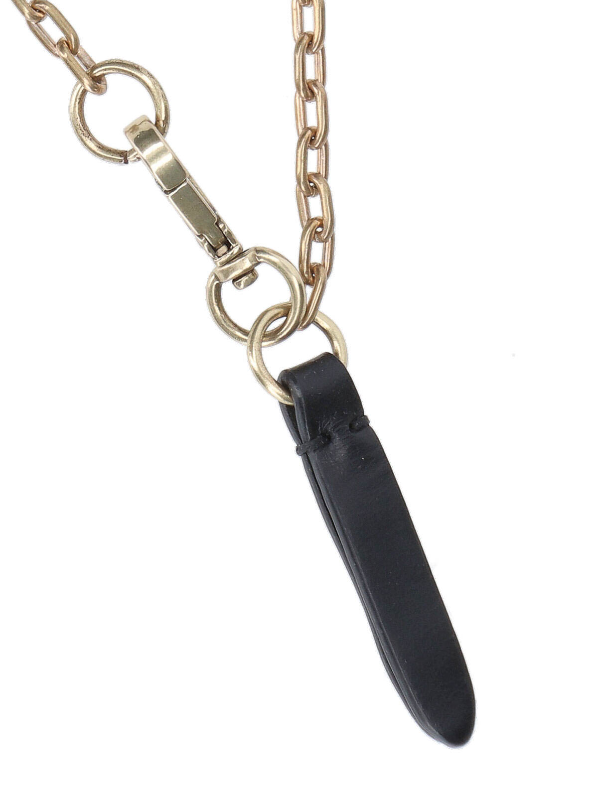 Golden gubbe our legacy necklace, in golden brass, lobster clasp, black leather charm detail.