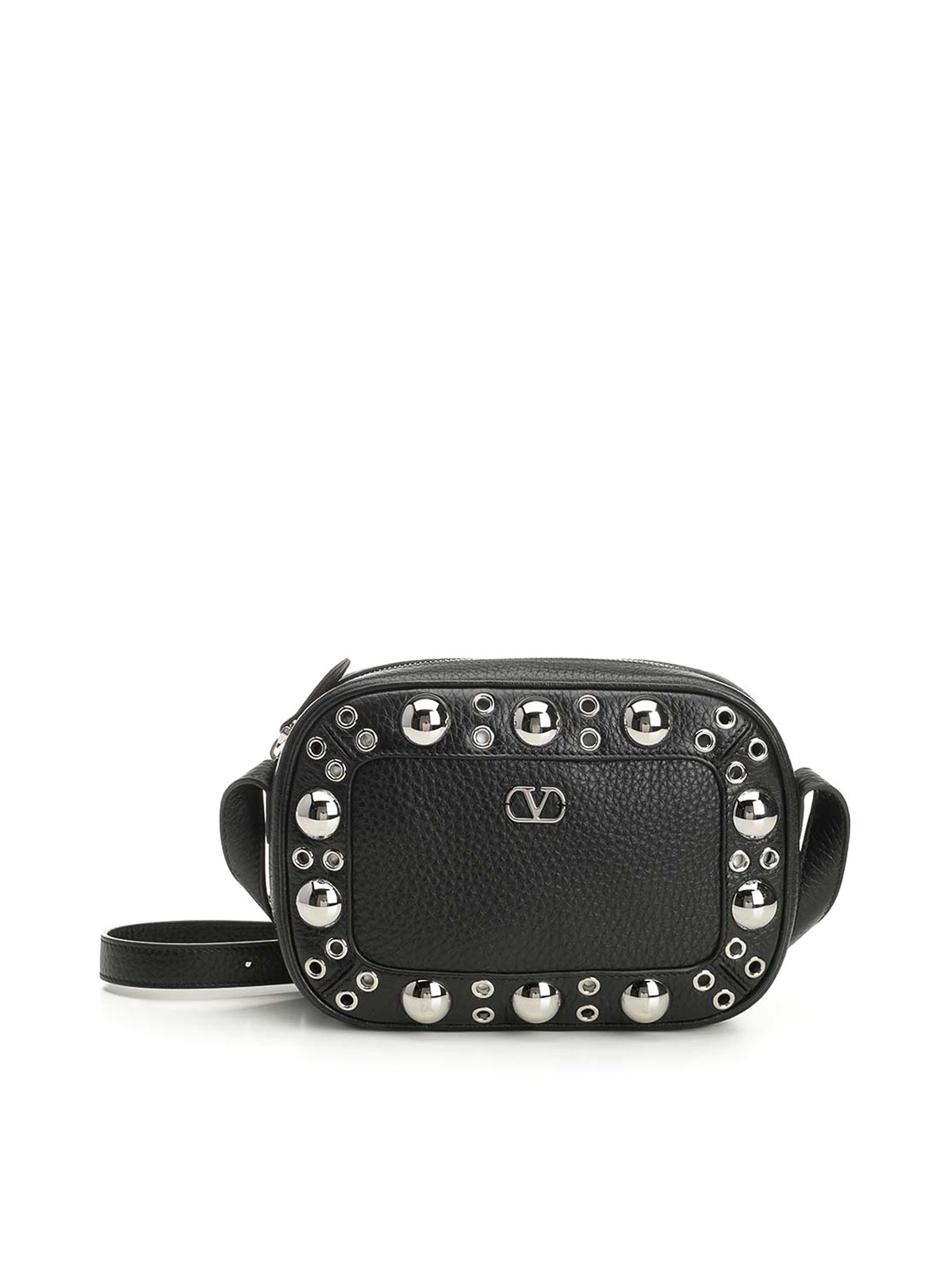 nellcte grained chain shoulder bag by valentino garavani featuring a profile decorated with sphere studs and rivets an adjustable shoulder strap palladium, finish hardware a small with vlogo signature a zip and an interior with a card holder pocket