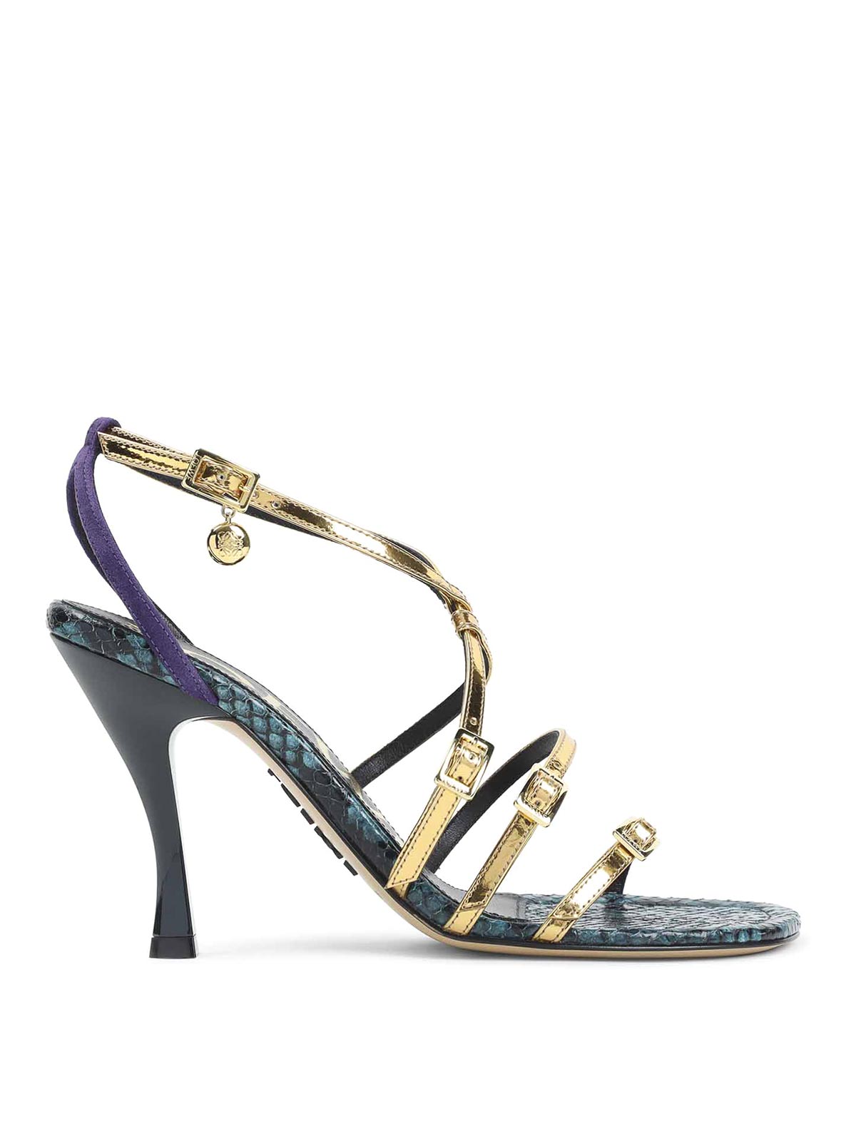 New comic 90 multicolor goatskin sandals. asymmetric design crafted from a mix of leather and colors, featuring a multi-strap vamp, the iconic petal toe, ankle strap with buckle, a slanted heel, and a leather insole and outsole.