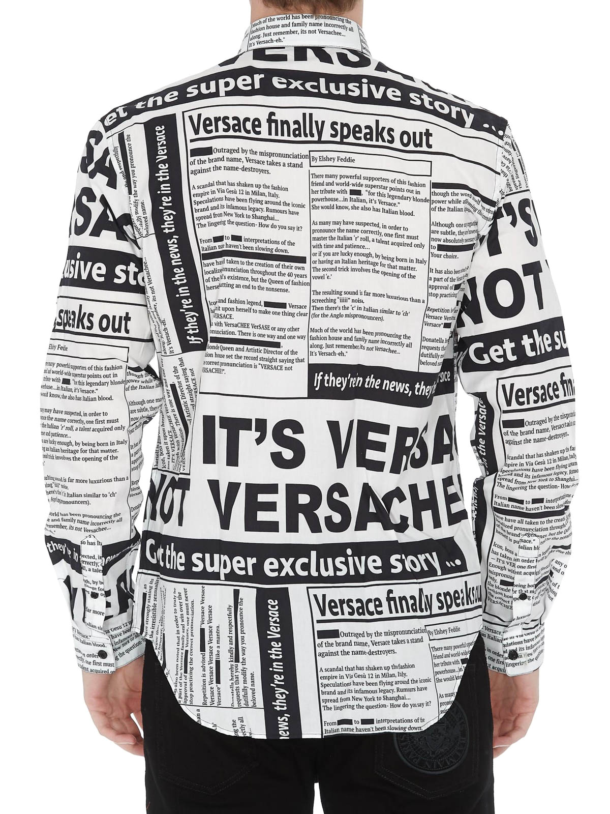 Cotton shirt featuring pointed collar, button placket, newspaper print and buttoned cuffs.