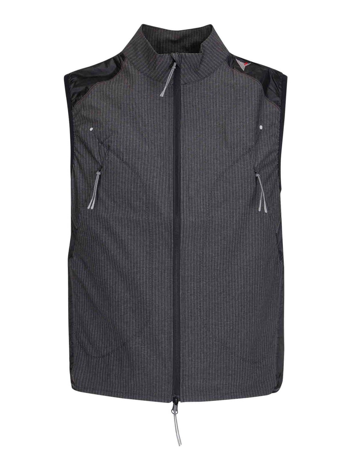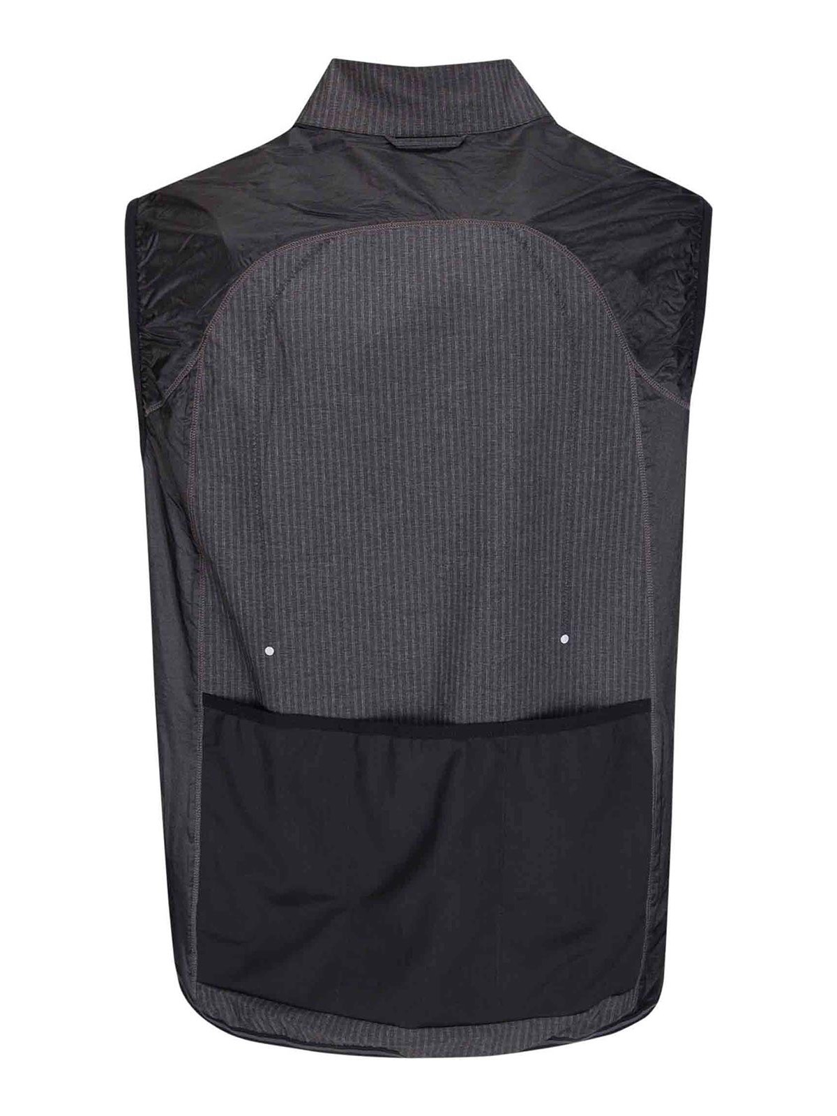 Lightweight nylon vest with regular cut, elasticated armholes, front pockets with invisible zips and rear mesh pocket.