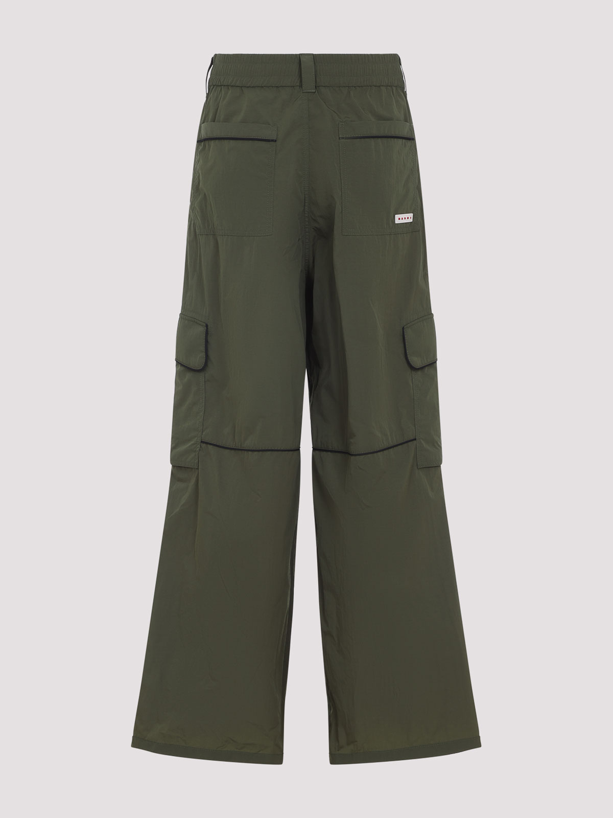 Marni green nylon cargo pants. crafted from green nylon, featuring a concealed drawstring at the waist, belt loops, a front button and zip fly, side pockets, two cargo pockets along the leg, two back flap pockets with branded label detail, a concealed drawstring at the hems, and a relaxed fit.