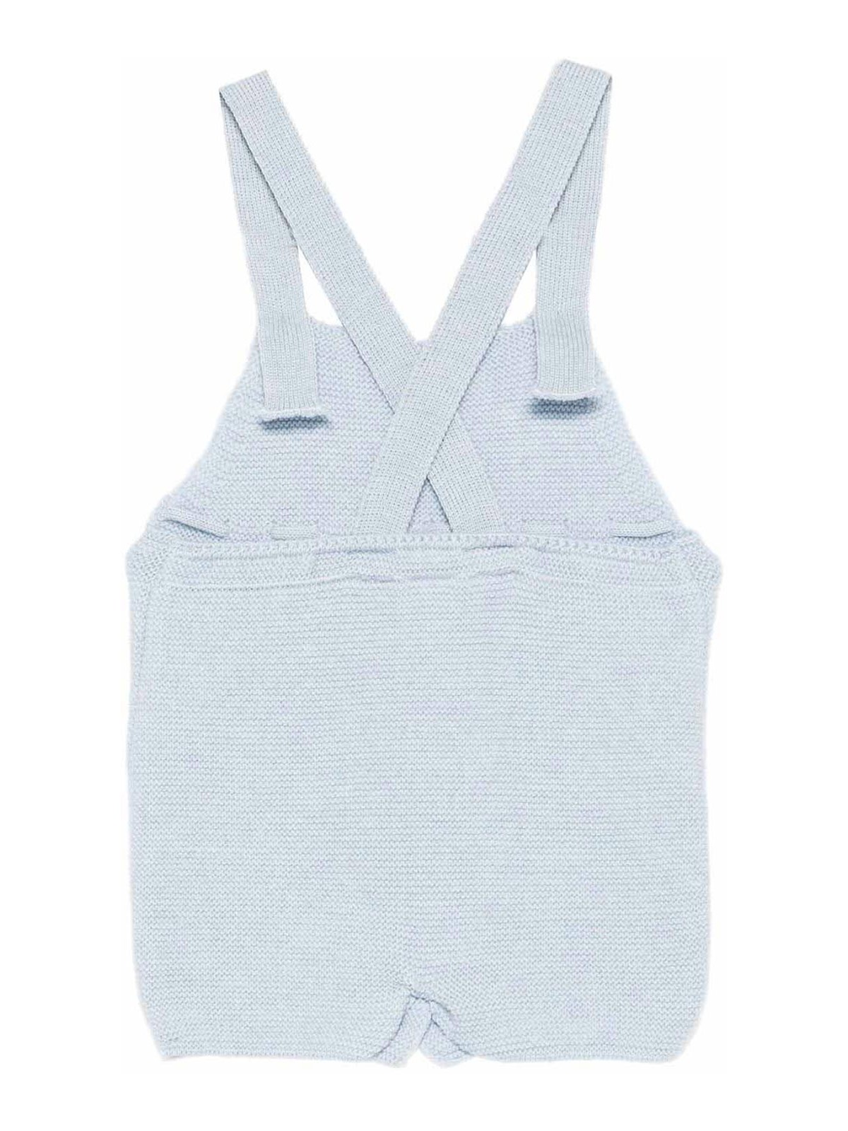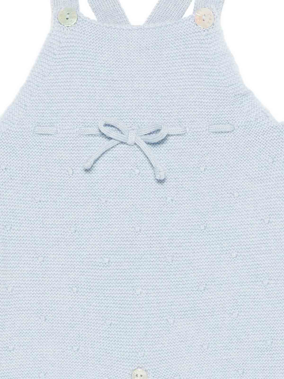 Playsuit with bow features light blue knitted straps crossed with buttons with bow