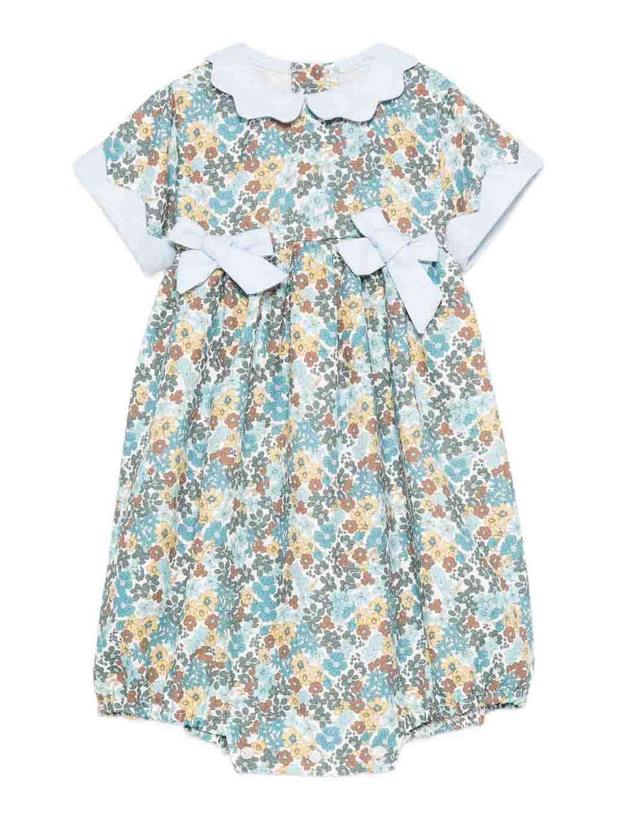 Playsuit with floral print features light blue bows peter pan collar short sleeves with buttons on the back