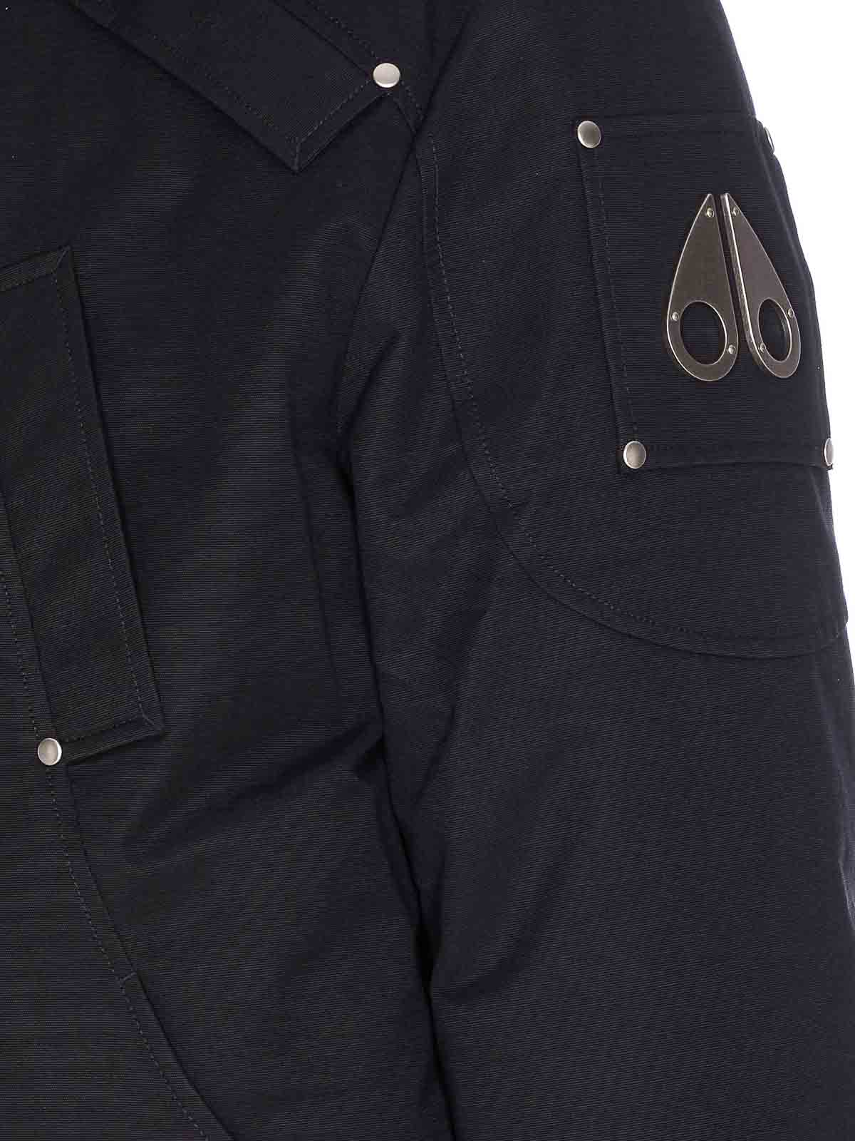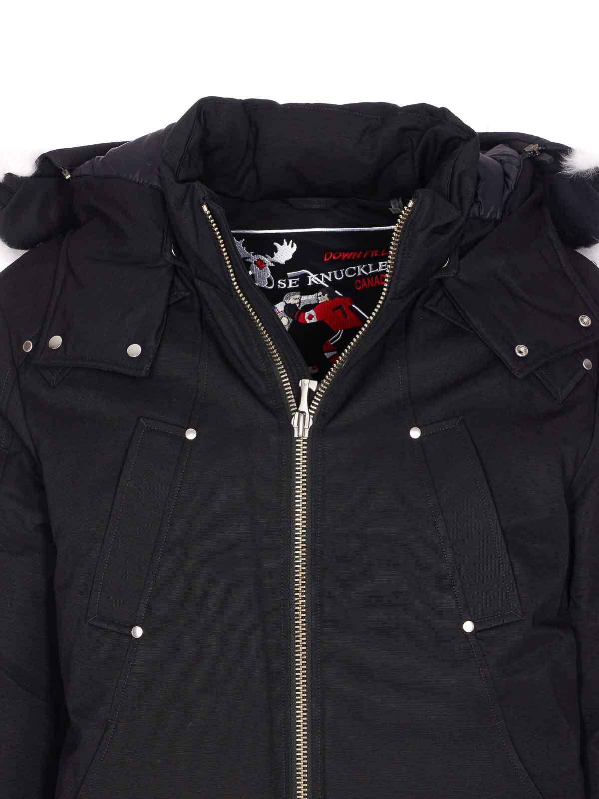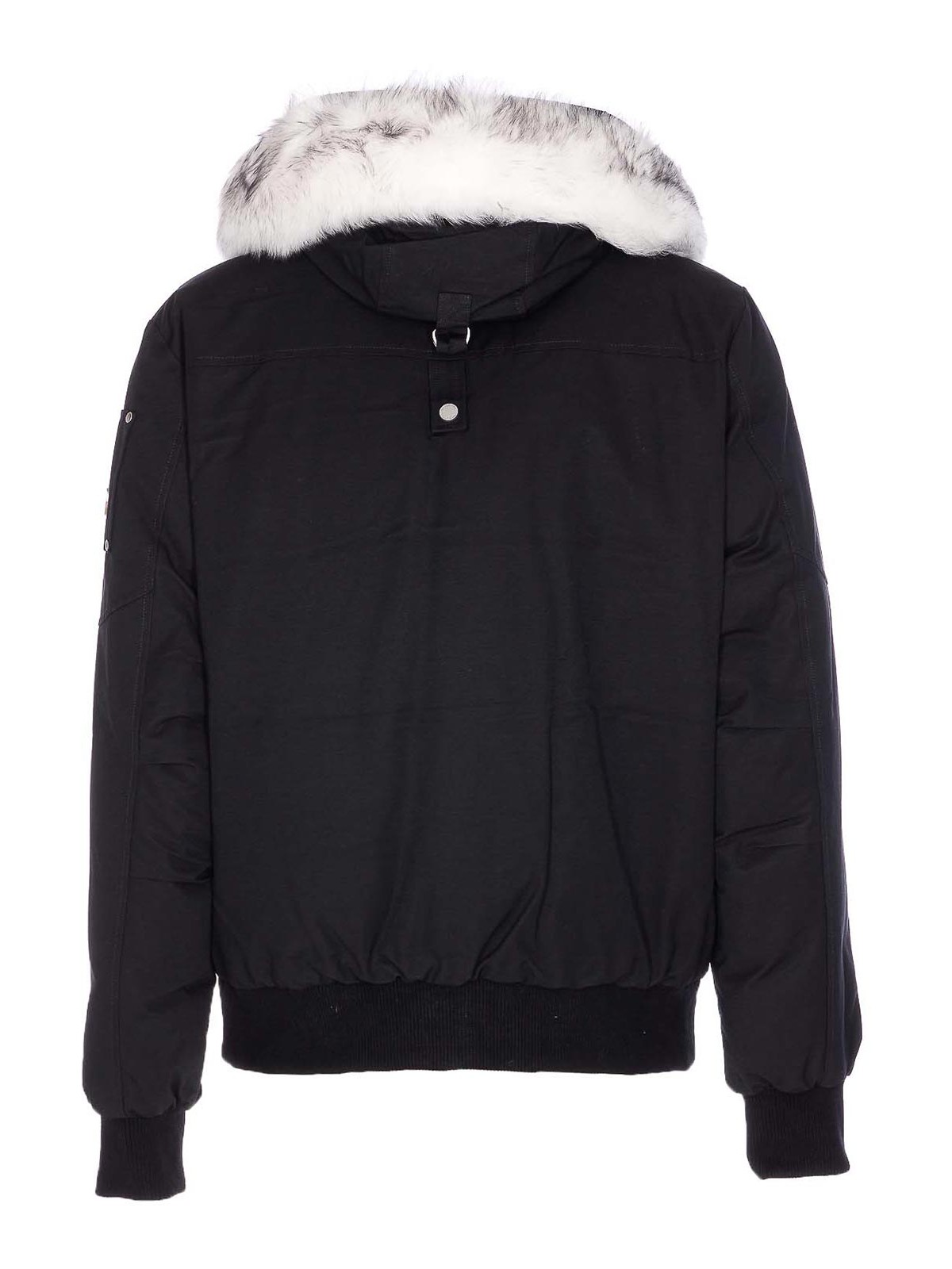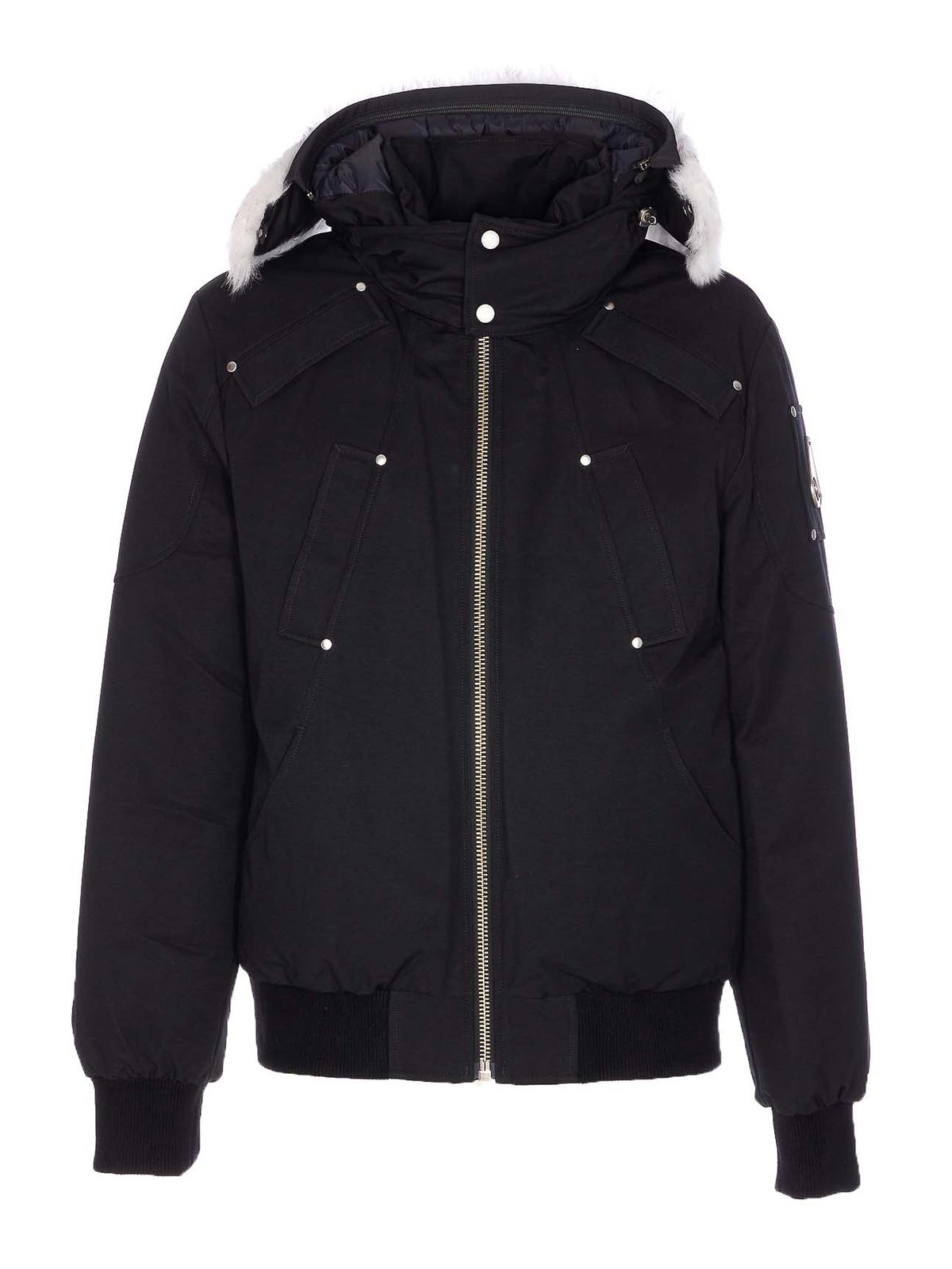 Moose knuckles black original ballistic bomber zip on the long sleeves removable hood padded lateral patch logo pockets