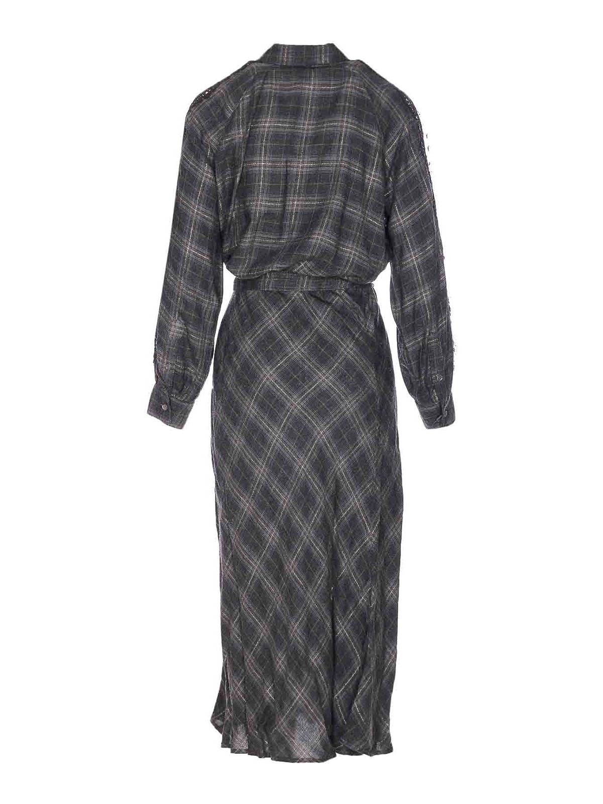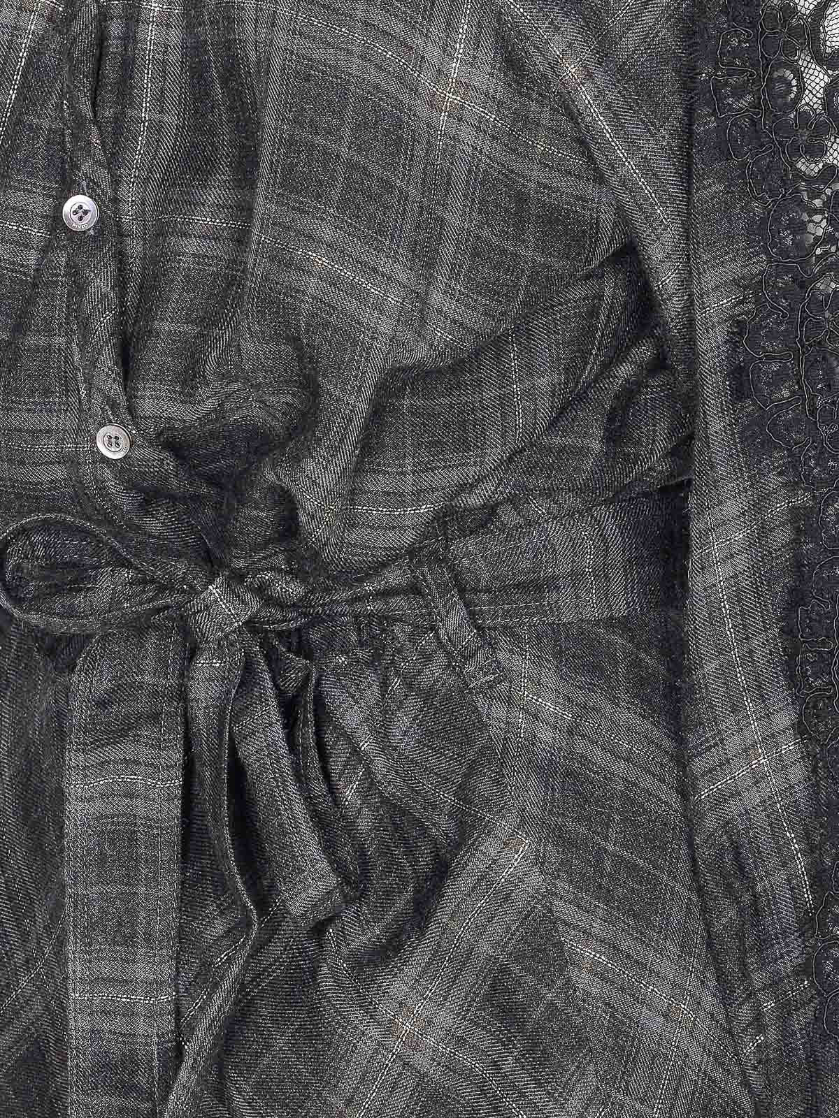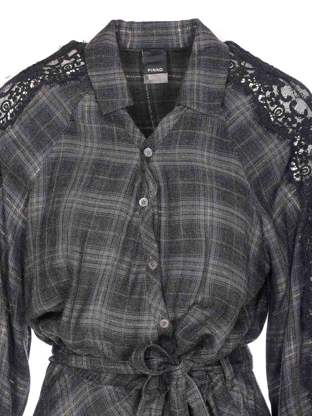 Pinko grey osane dress, buttons closure, lace detail, belt on waist, check motif, long sleeves