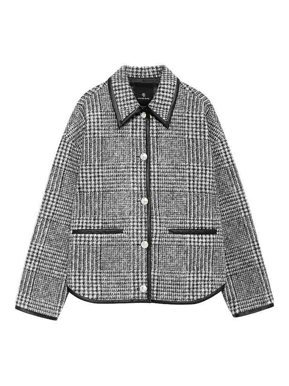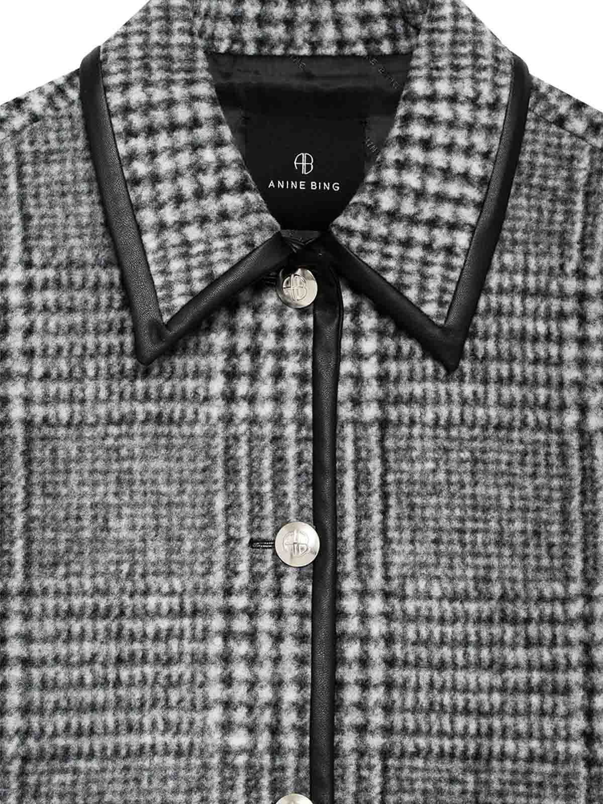 Black, check pattern, faux leather trim, button fastening, welt pockets