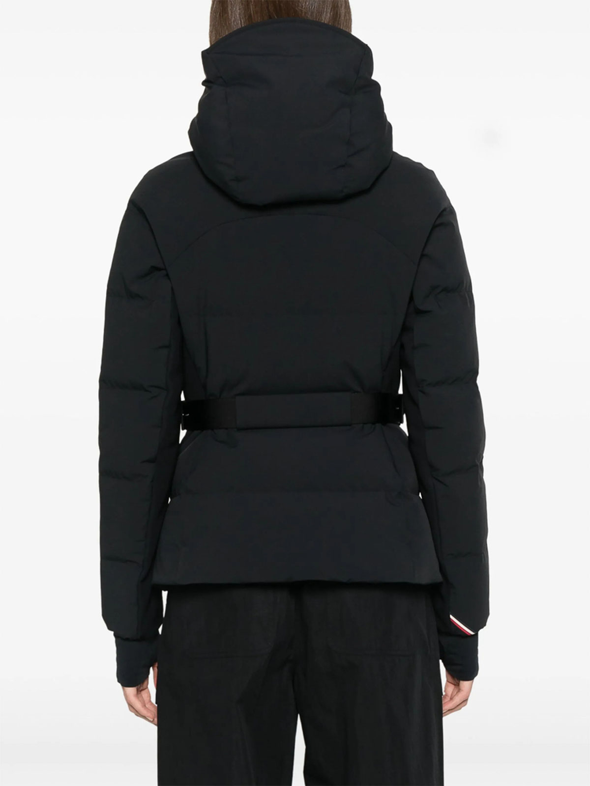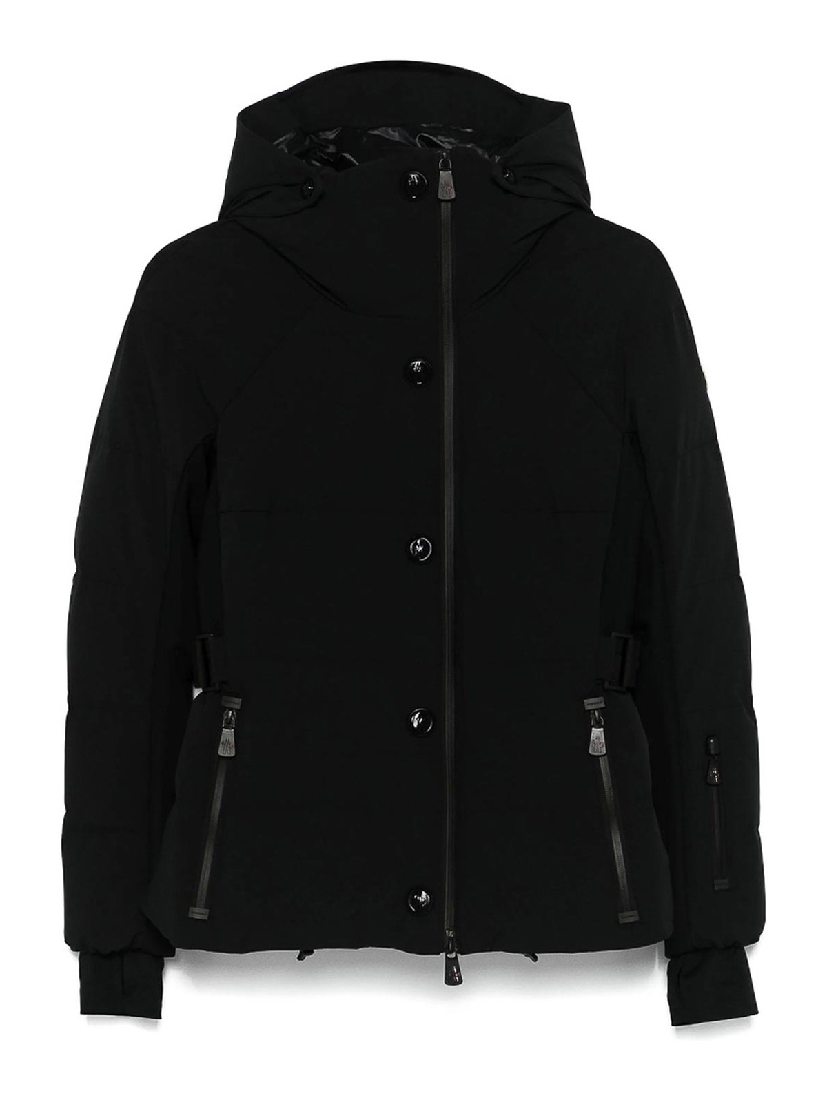 Black windproof water, resistant padded design goose, two, way aquaguard zip detachable hood funnel neck long raglan sleeves logo patch at the ski pass zip pocket layered ribbed cuffs with thumb slots waist tabs two side zip, pockets zip, pocket full powder skirt elasticated hem straight hem