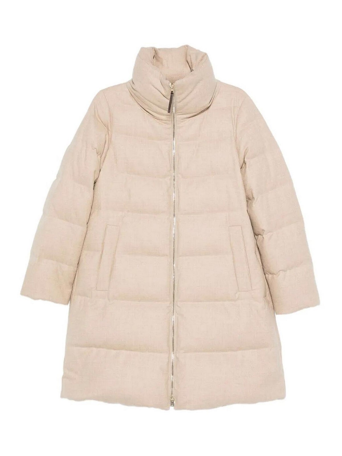 Beige, quilted design, high collar, front zip closure, long sleeves, side pockets