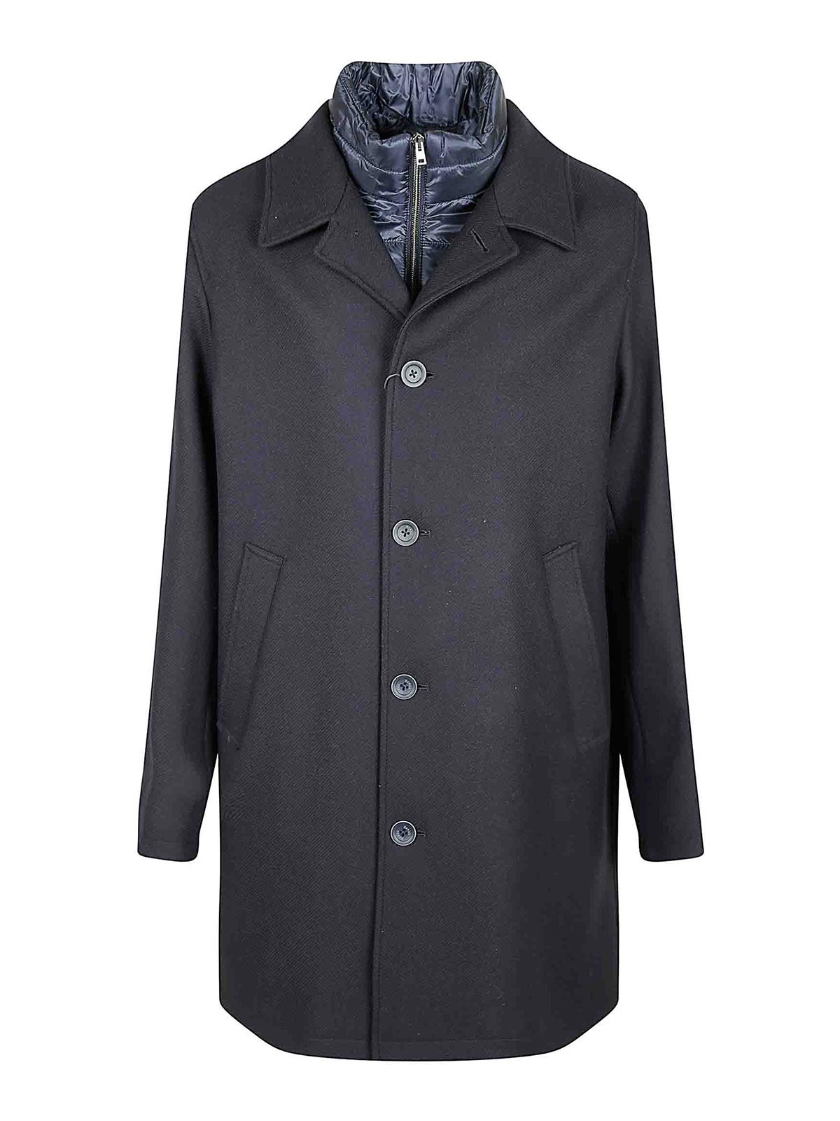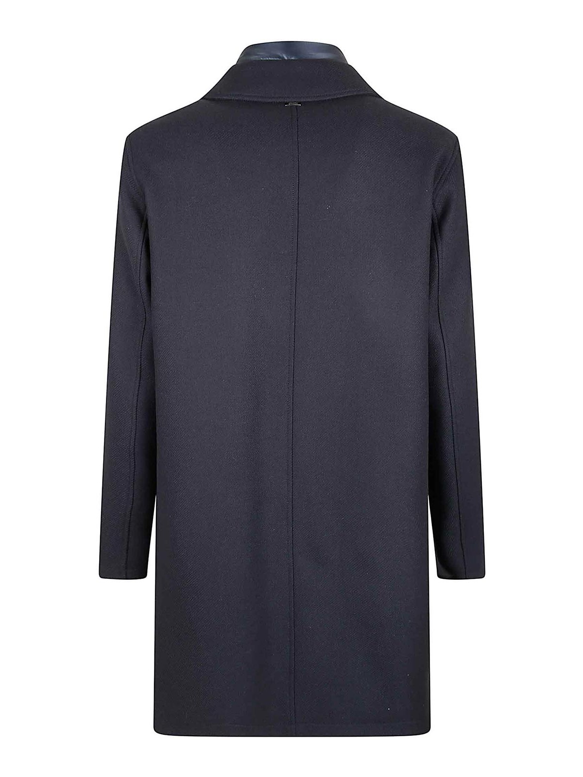 Herno diagonal-effect recycled wool melton carcoat, high collar, zip and button closure, side pockets, wadding, regular fit, featuring a metal Herno logo on the back.