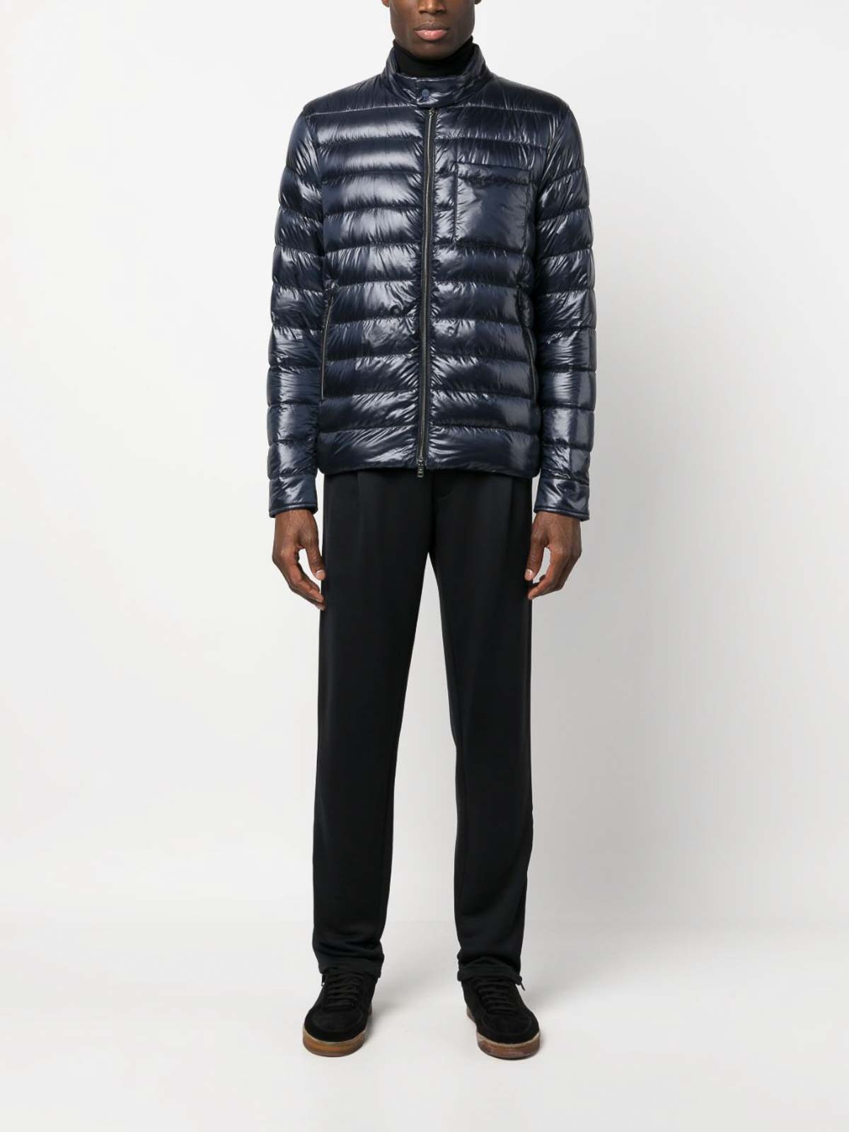 Padded zip-up jacket from herno featuring navy blue goose padded design quilted silver-tone logo plaque band collar zip long sleeves buttoned cuffs chest patch pocket zip pockets and straight hem