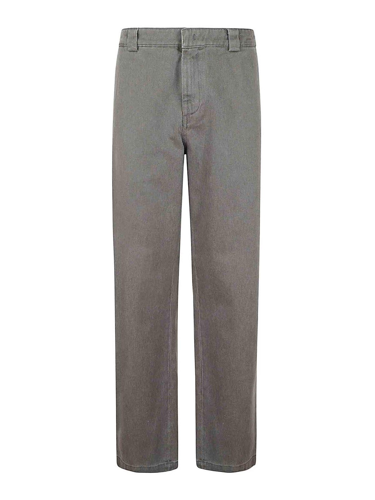 Gray aged cotton trousers, zip fastening, belt loops, slanted front pockets, rear welt pockets, 24 cm at the bottom.