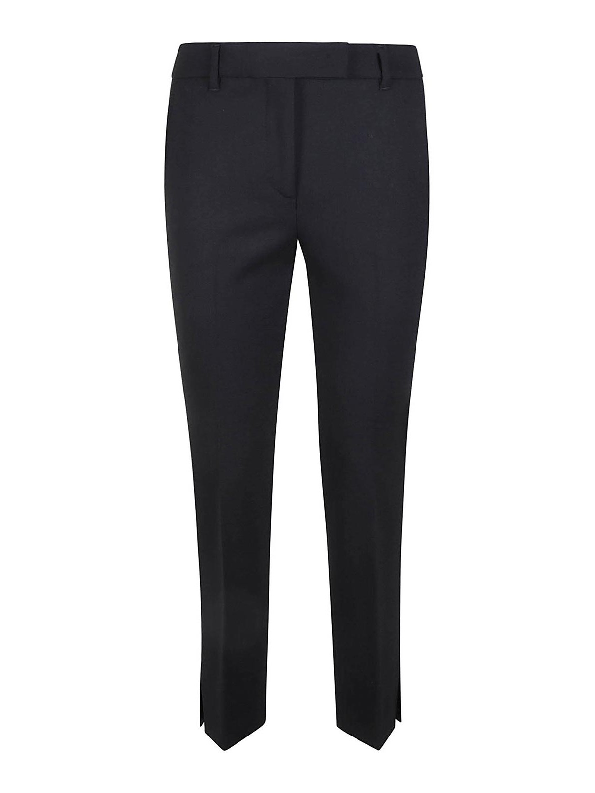 Stretch wool trousers, zip and button fastening, belt loops, front slanted pockets, rear welt pockets, tailored stitching, slit hem