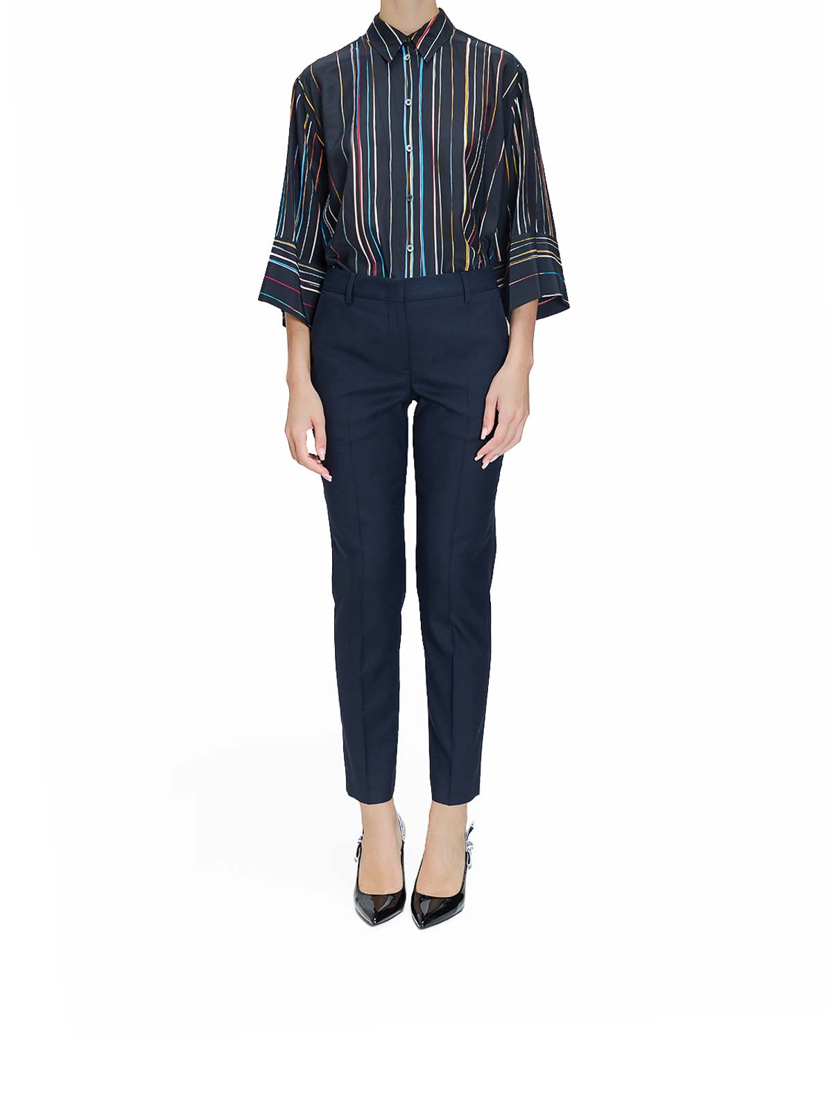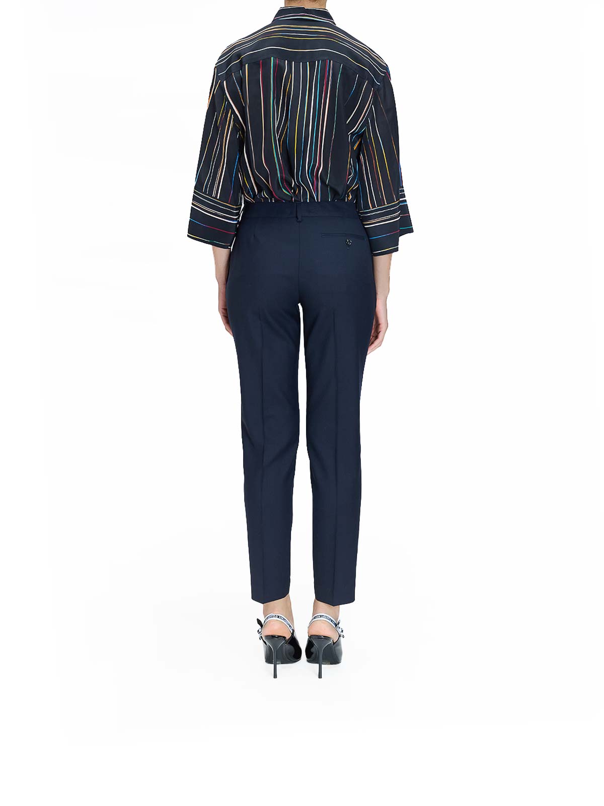Travel suite trousers in navy blue. Slim-fit tailored wool trousers from the Paul Smith A Suit to Travel In collection. They feature two center pleats, a mid-rise with a hook closure, and two side pockets. Slim fit, high-twist wool for wrinkle resistance, mid-rise, hook closure, center pleats, two side pockets, a back button pocket. Color: Navy blue, 100% wool, Made in Italy.