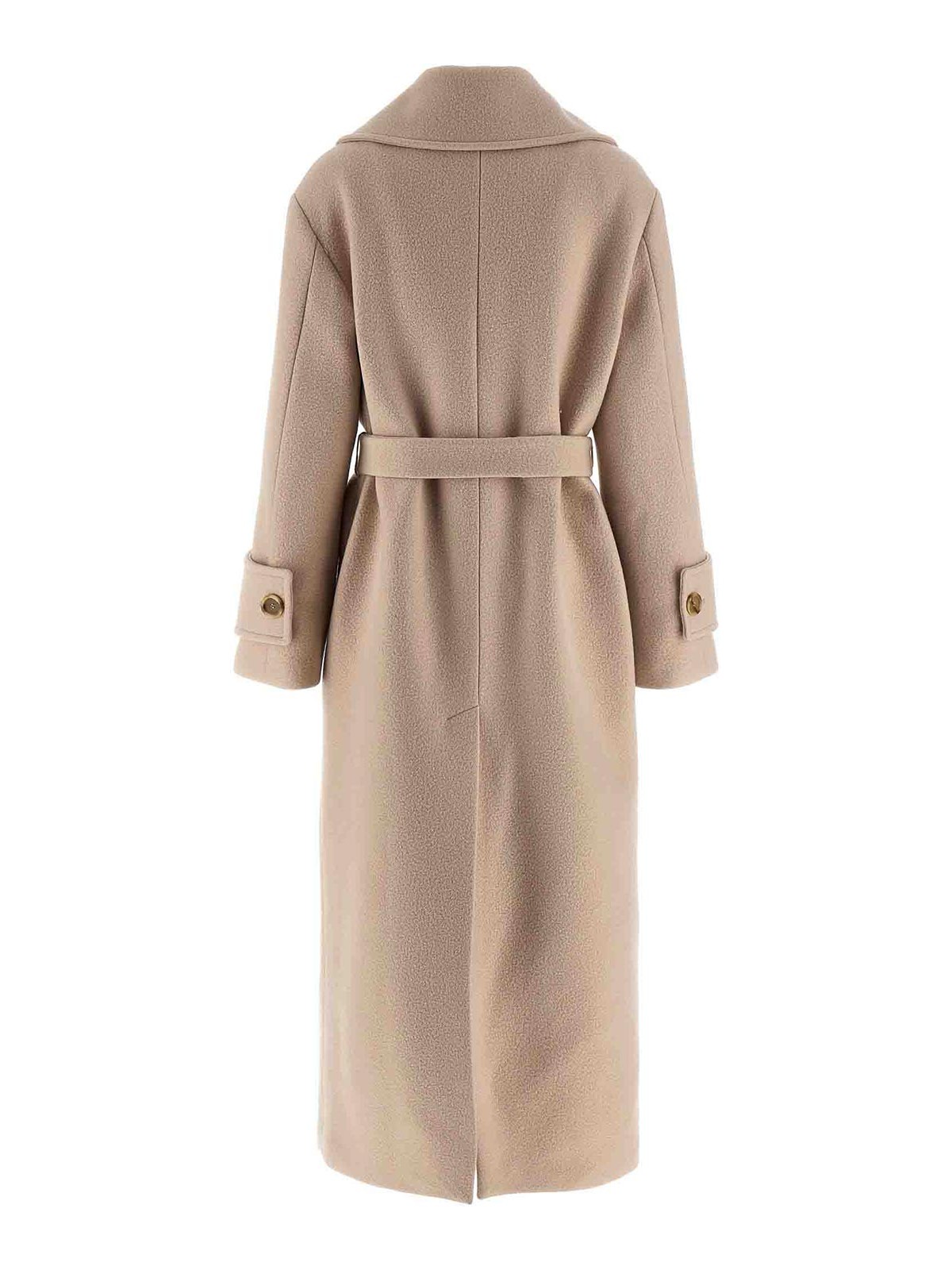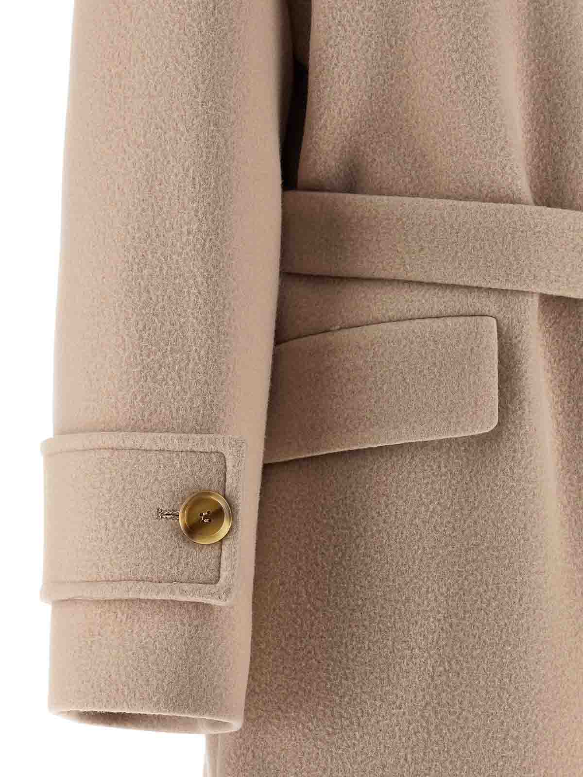 paquita' coat in wool-effect fabric, shirt collar with flap that can be closed at the neck, front closure with covered buttons, knotted belt at the waist, long sleeves with martingale on the cuff.