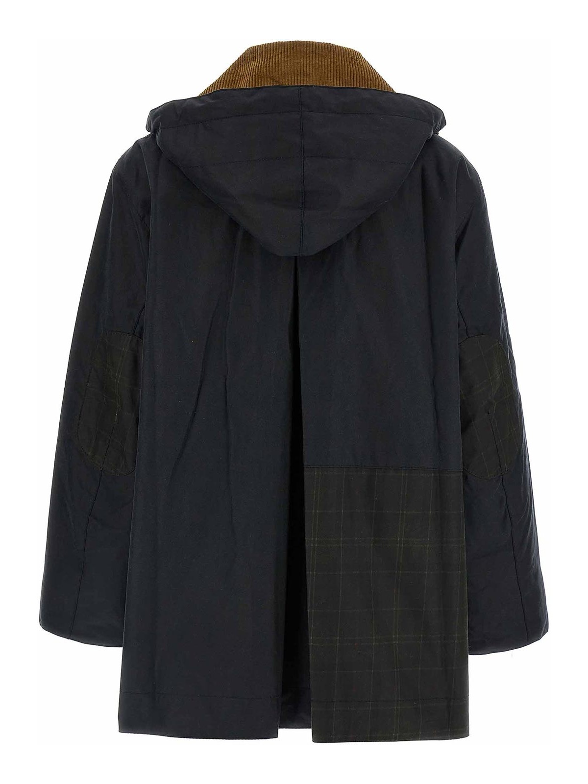 Barbour x ganni waxed cotton parka with corduroy maxi collar, removable hood, front pockets with check print, front zip closure, front logo patch, long sleeves with check patch.
