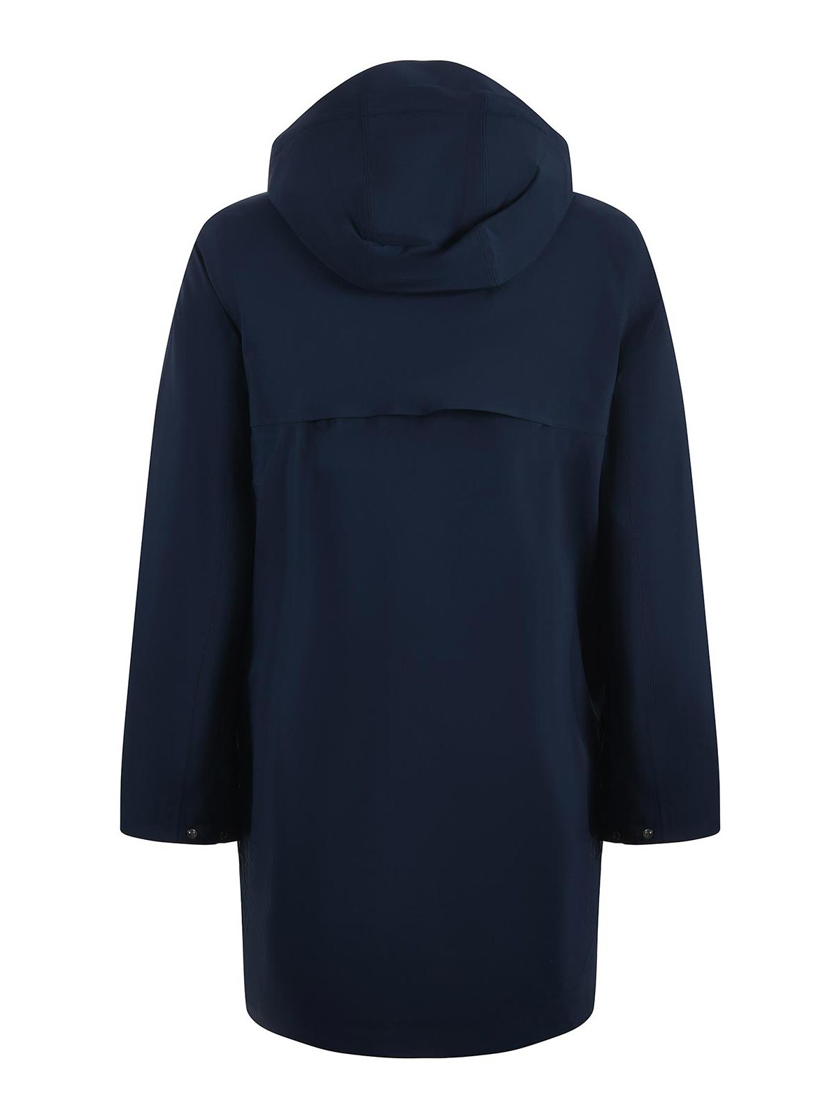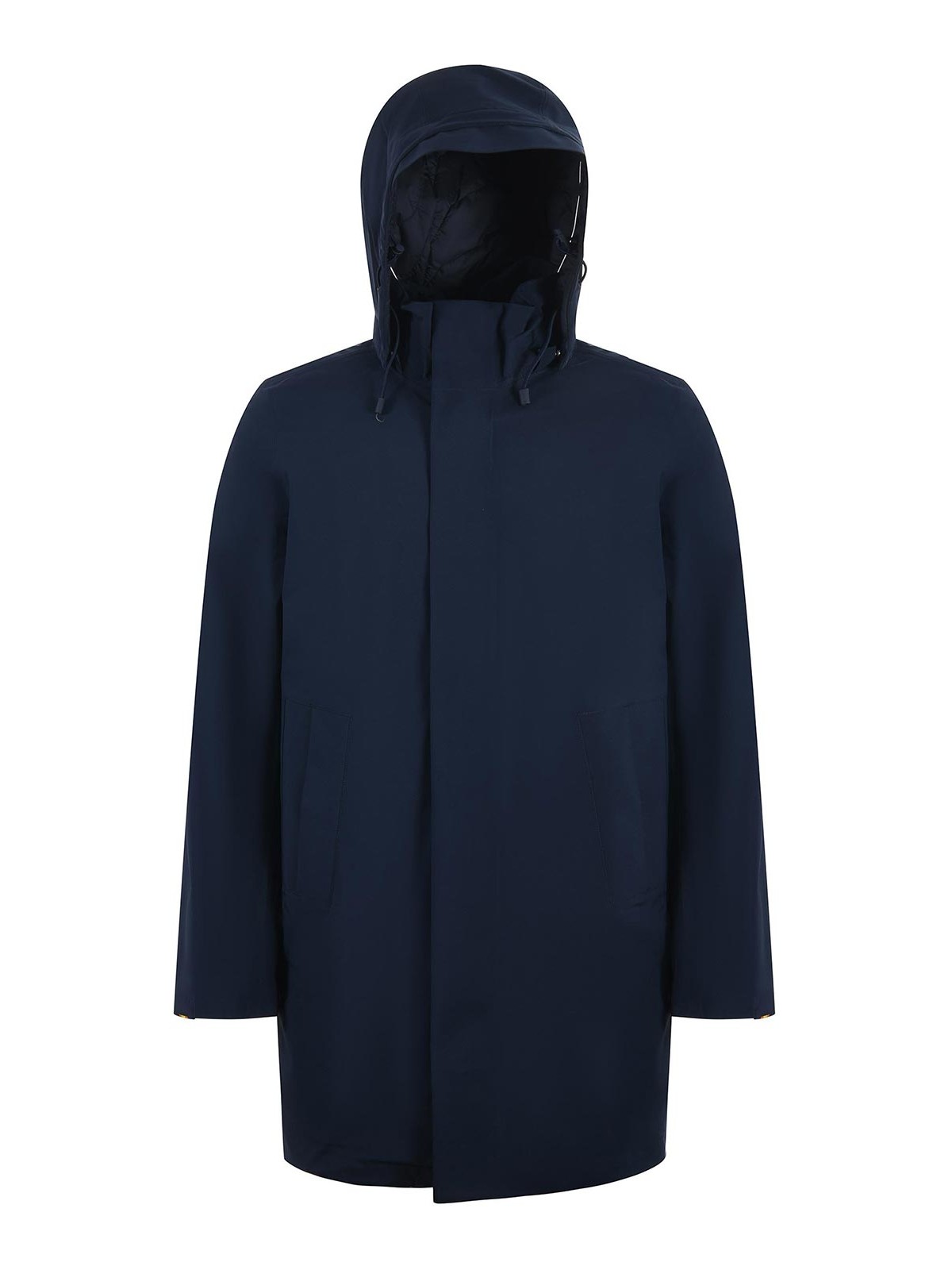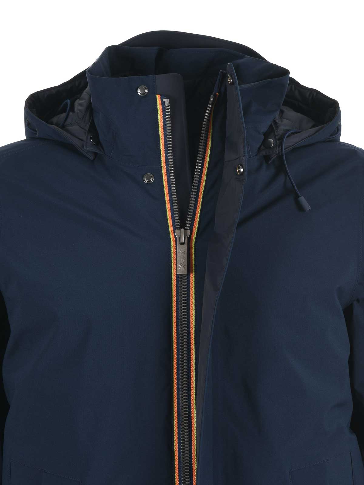 K-way parka in dark blue technical fabric. lined with a padded quilt. waterproof. water-repellent. windproof. heat-taped seams. removable hood. two-way zip closure with snap buttons. welt pockets. slim fit. multicolored label on the cuff. size shown: m 76% polyester, 24% polyurethane padding: 100% polyester