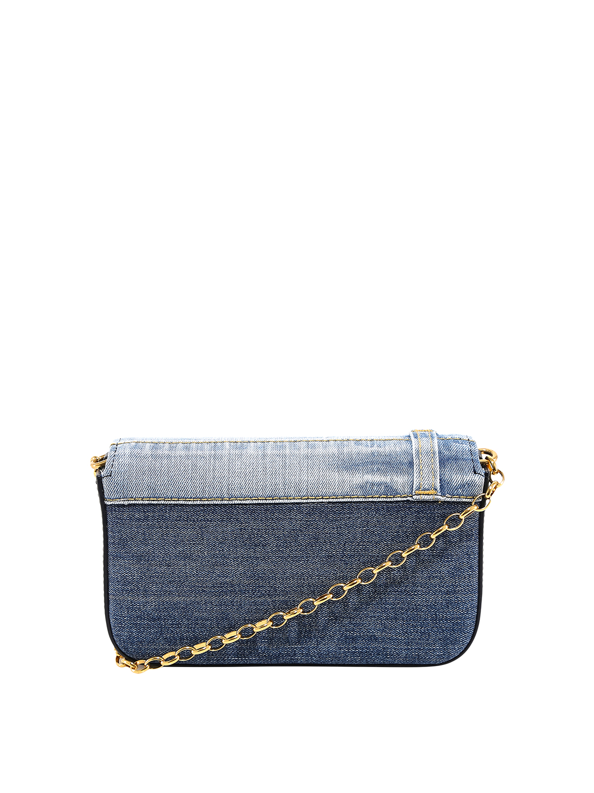 Patchwork denim bag featuring gold-tone chain cross body bag detailed with one compartment and embellished logo hardware.