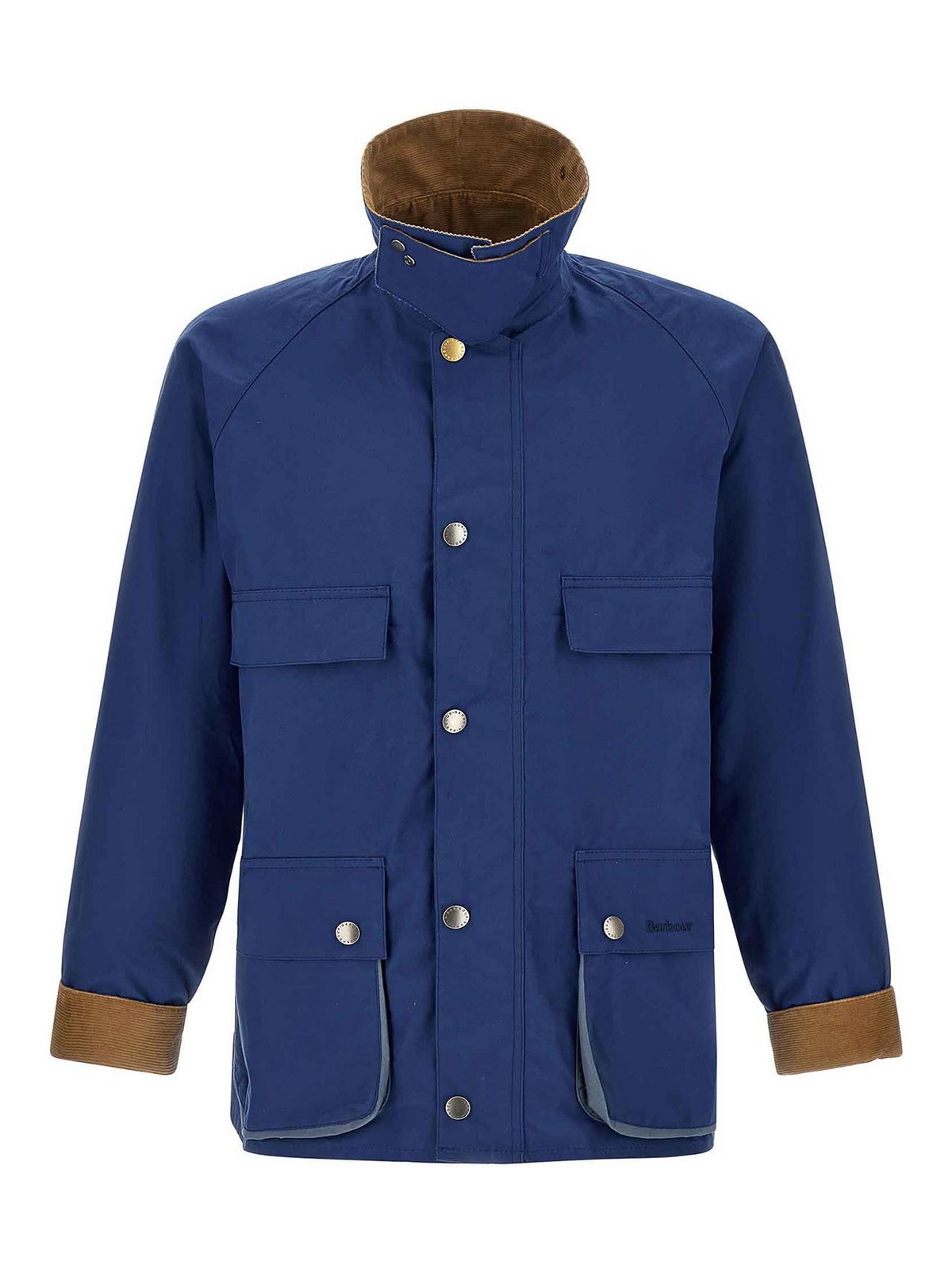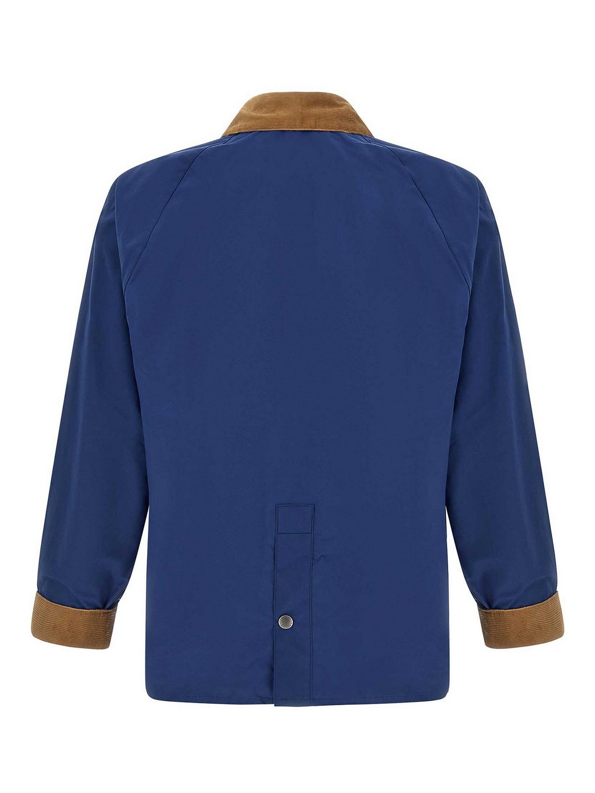 Paul smith loves barbour 'sugarlump bedale' waxed cotton jacket with contrast corduroy shirt collar with chinstrap, half inner lining with print, tone-on-tone front logo embroidery, flap and snap pockets, front zip and button closure, contrast appliqu details with iconic 'paul smith striped pattern', long sleeves with turned-up cuffs with ribbed velvet finish.