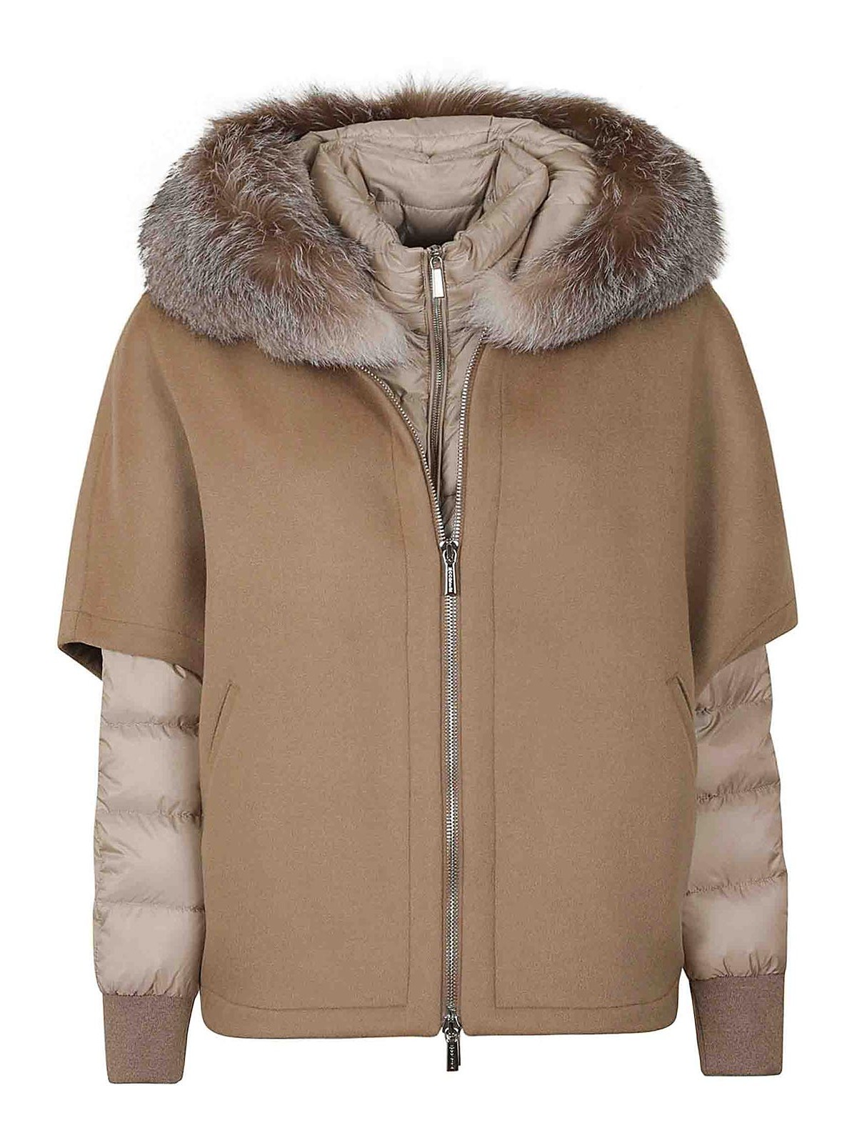 Short cape in wool blend, ribbed knit collar, detachable internal jacket padded with goose down, zip fastenings and knitted cuffs, detachable hood finished with real fox trim