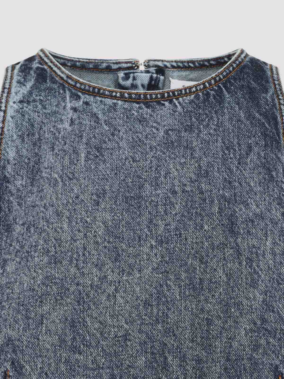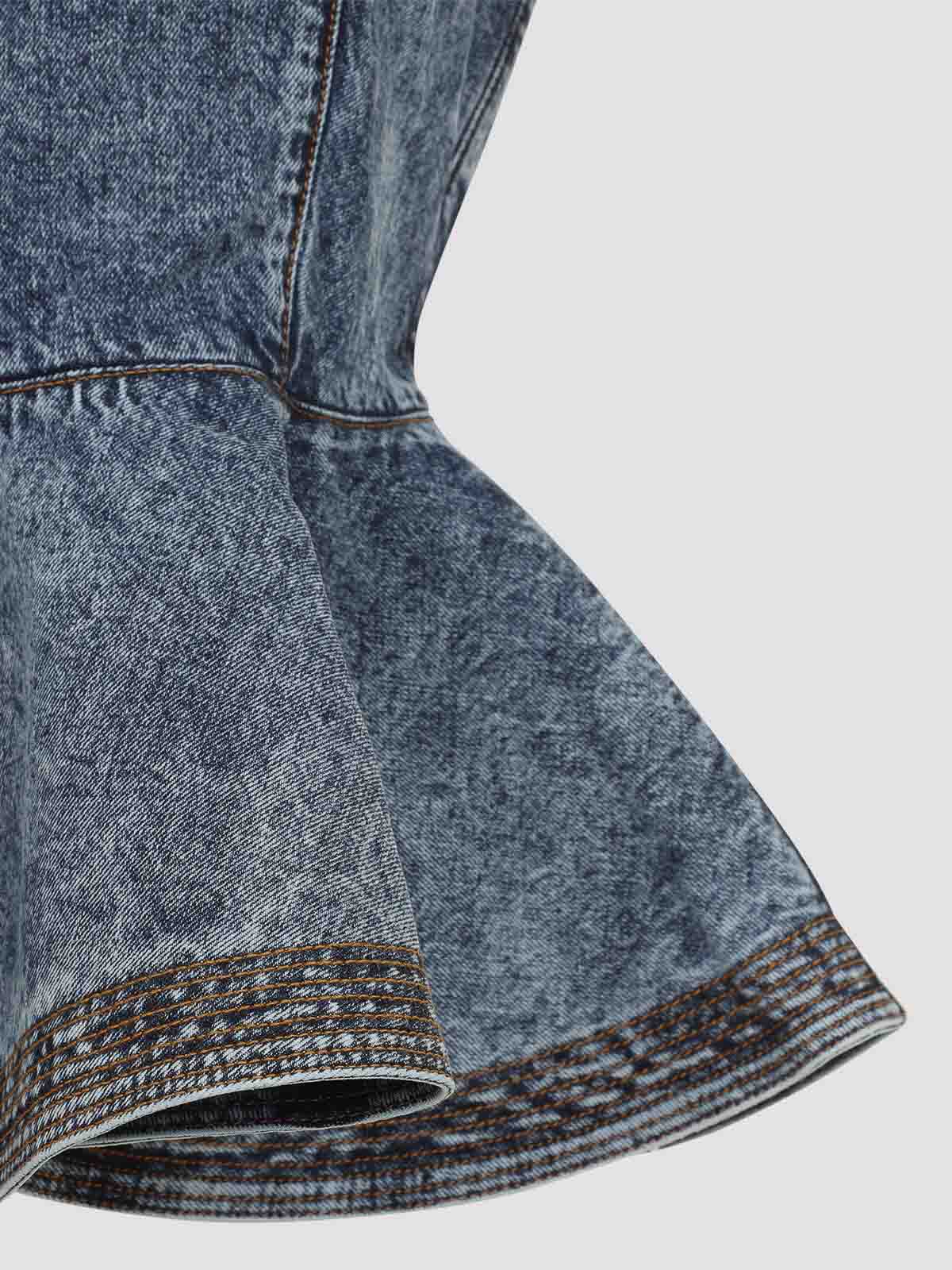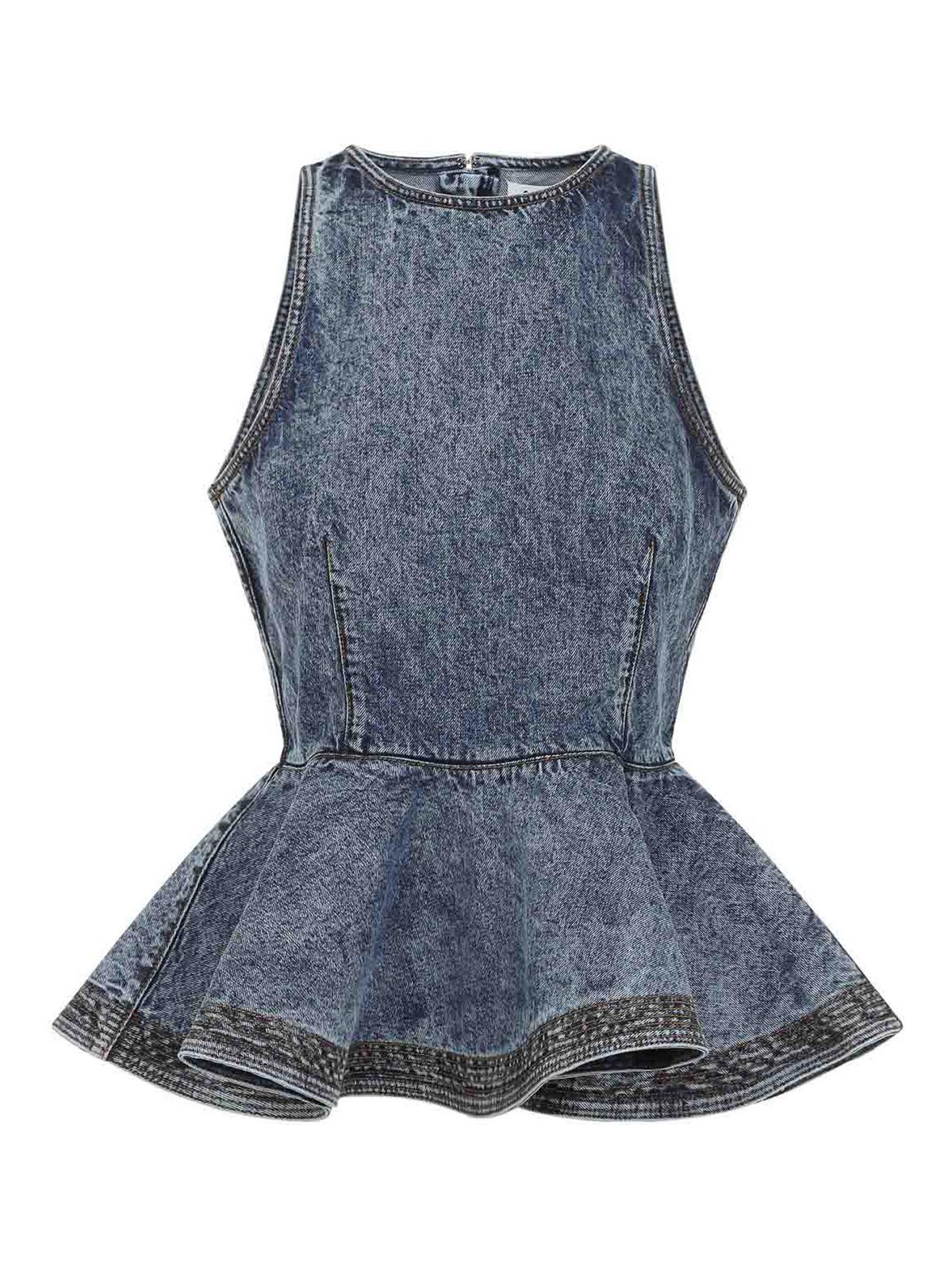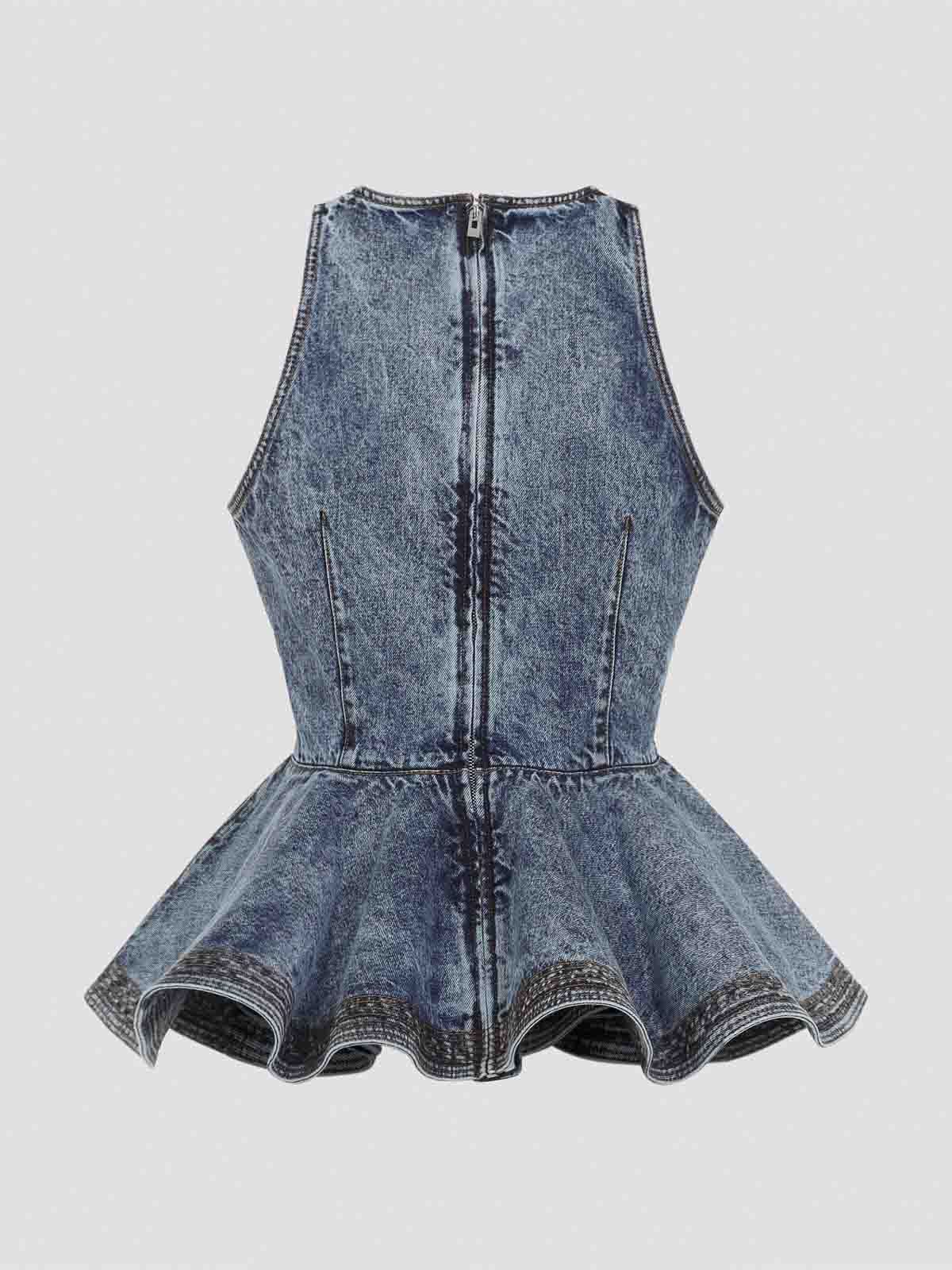 Alaa peplum blue cotton top. sleeveless top crafted from faded blue cotton denim, featuring a round neckline, a zip fastening at the back, and a peplum hem.