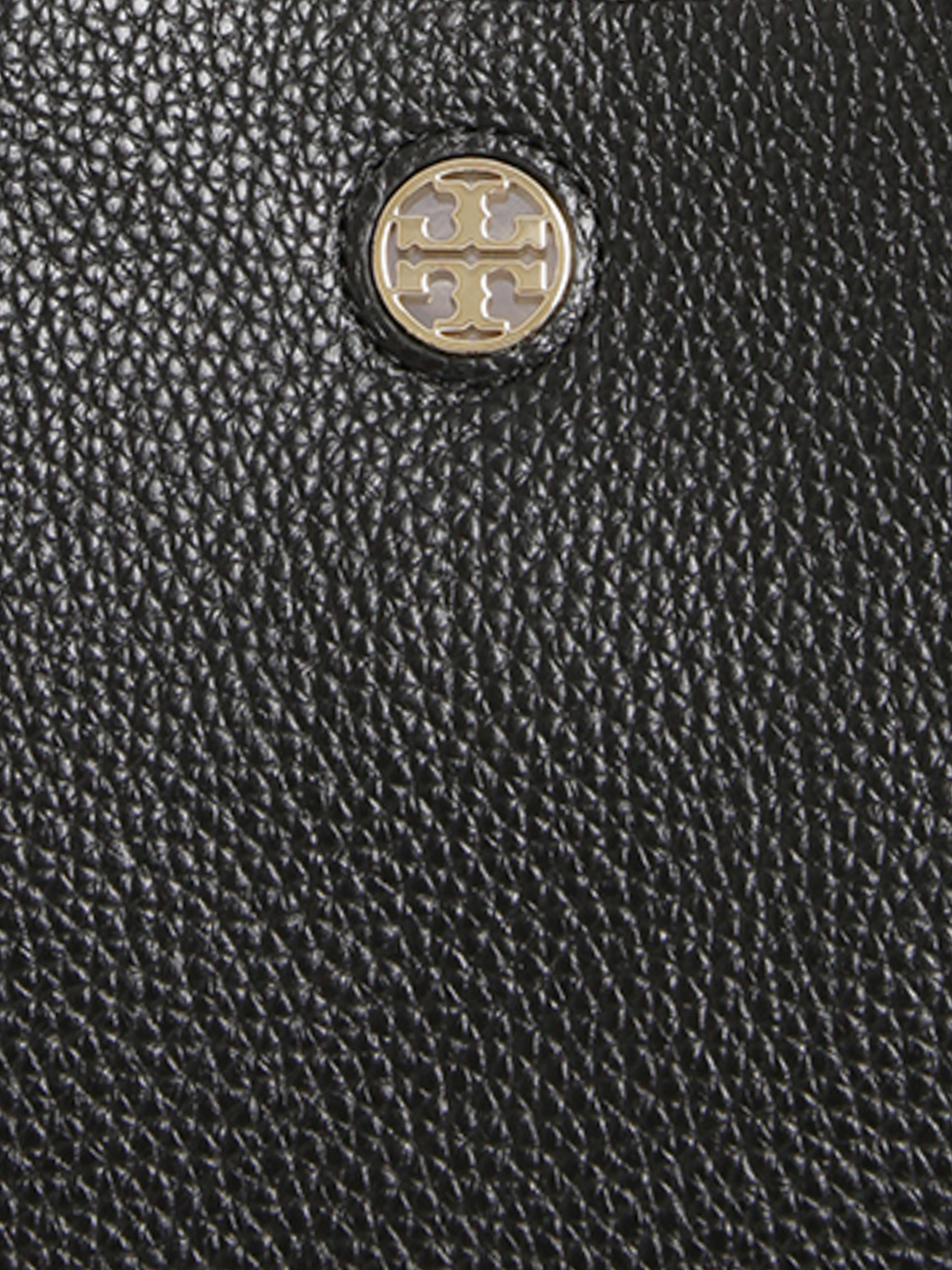 Shopping tote in pebbled leather with resin backing featuring a round metal logo plaque on the front, double flat leather handles, an open top, a roomy contrast-color interior and an inside hanging pocket with one smartphone compartment.