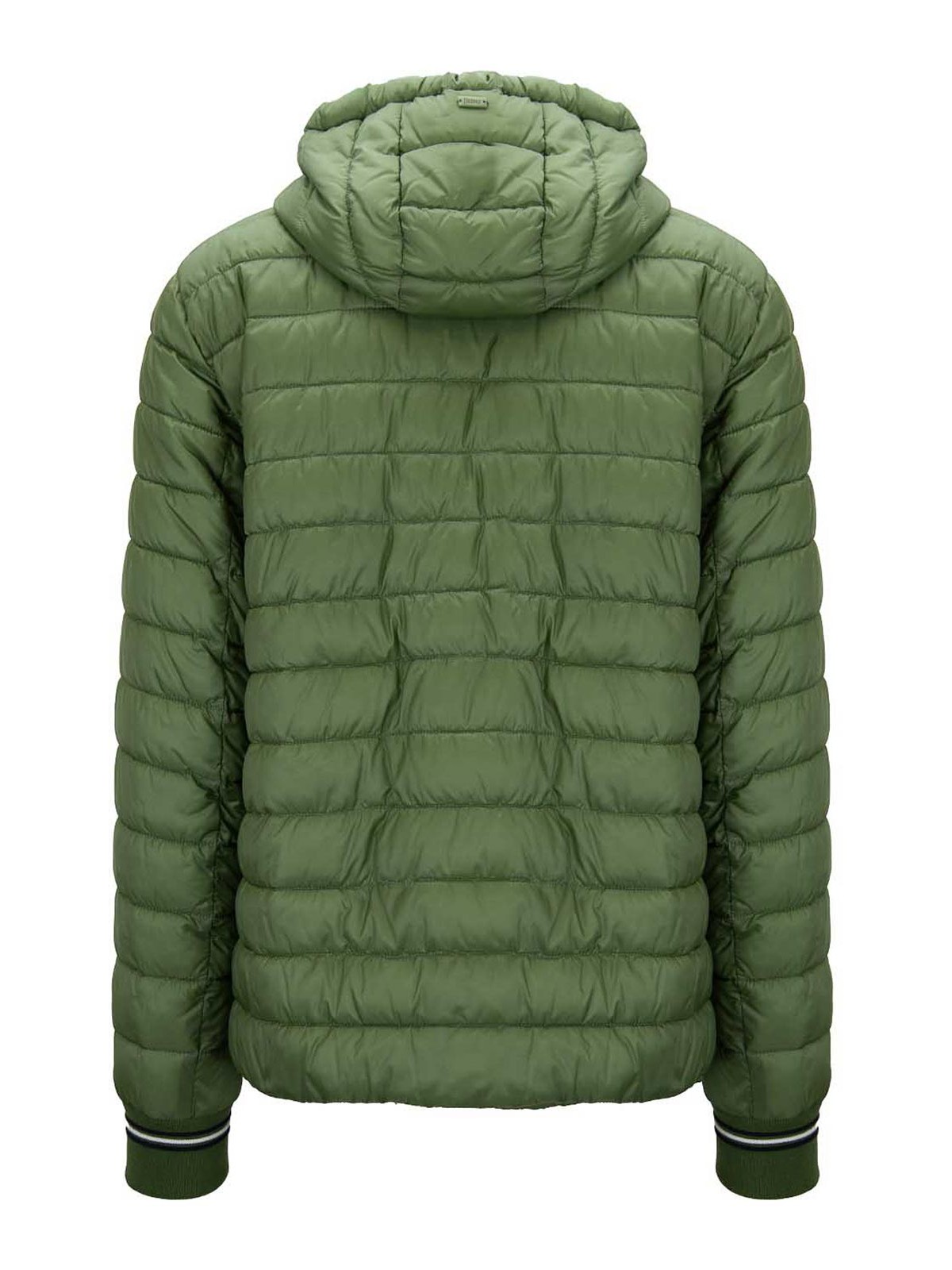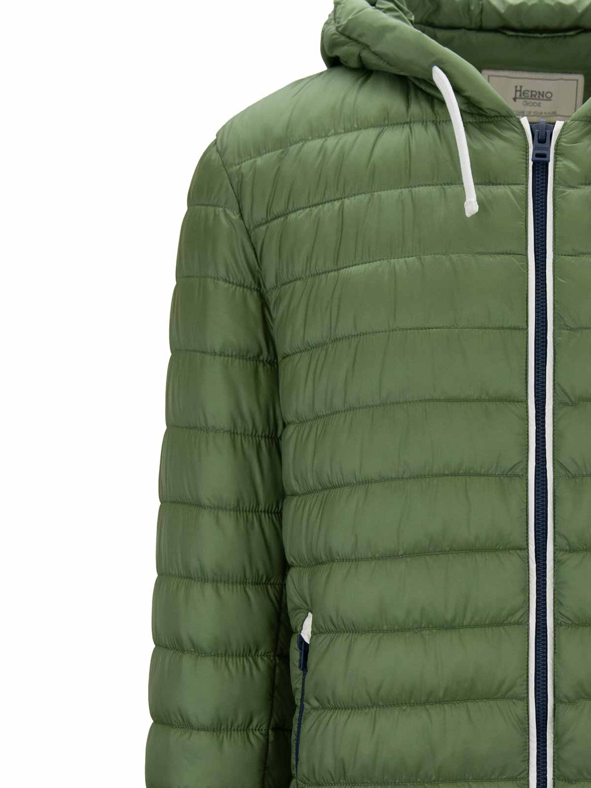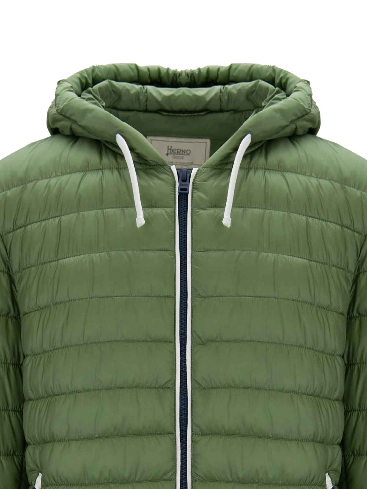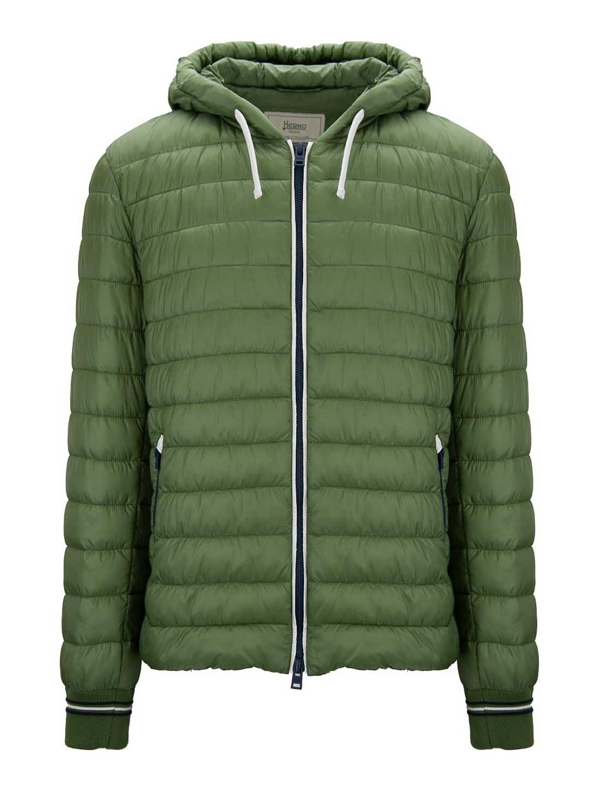 Piumino da uomo firmato herno. tessuto principale, secondario e fodera realizzati 100% in poliammide. bordi in maglia realizzati 100% in cotone. imbottitura realizzata in fibre 100% poliestere. piumino con cappuccio, regolabile tramite lacci, a maniche lunghe, quest'ultime presentano polsini realizzati in maglia a costine. tasche laterali sul davanti con chiusura tramite zip. presenta, ad altezza cappuccio, hardware logato. Elasticized life. Double cursor zipper closure.