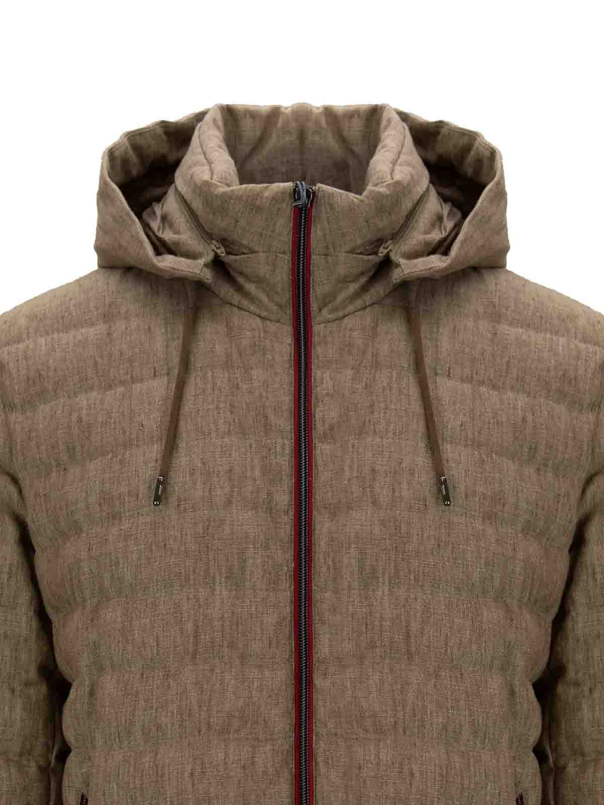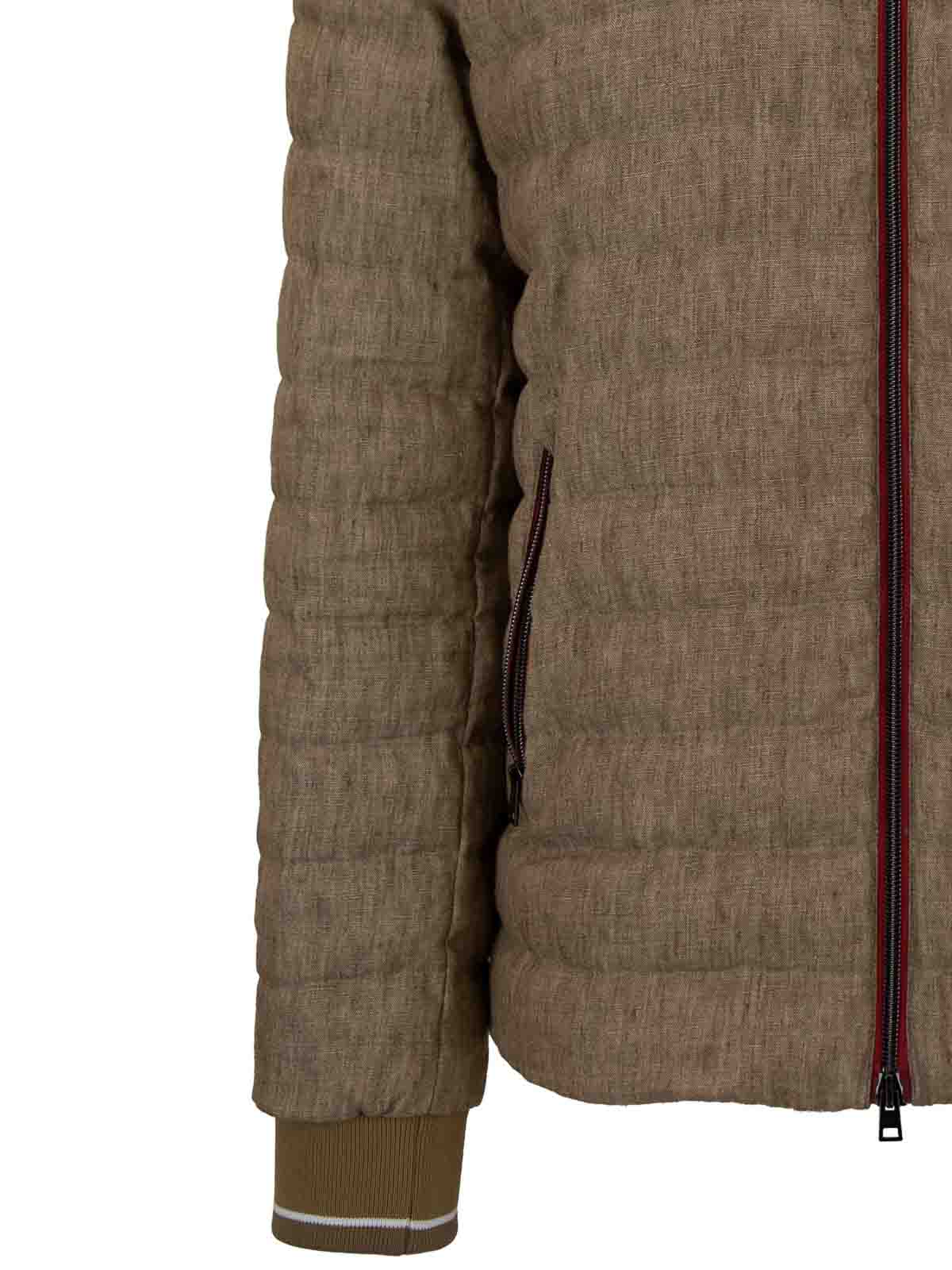 Piumino da uomo firmato herno. tessuto principale realizzato 100% in lino. fodera principale e secondaria realizzata 100% in poliammide. Borders in jersey made 98% in Polyamide and 2% in Elastan. adorni principali realizzati 68% in viscosa e 32% in poliestere. adorni secondari realizzati 100% in poliestere. Packaging made 90% in duvet and 10% feather. Piumino with high collar and hood, removable by zipper and adjustable via laces, with long sleeves, with cuffs made of ribbed jersey. tasche laterali sul davanti con chiusura tramite zip. It presents, on the back at collar, logo hardware made of silver metal. Elasticized life. Double cursor zipper closure.