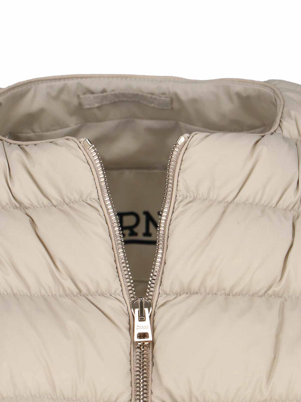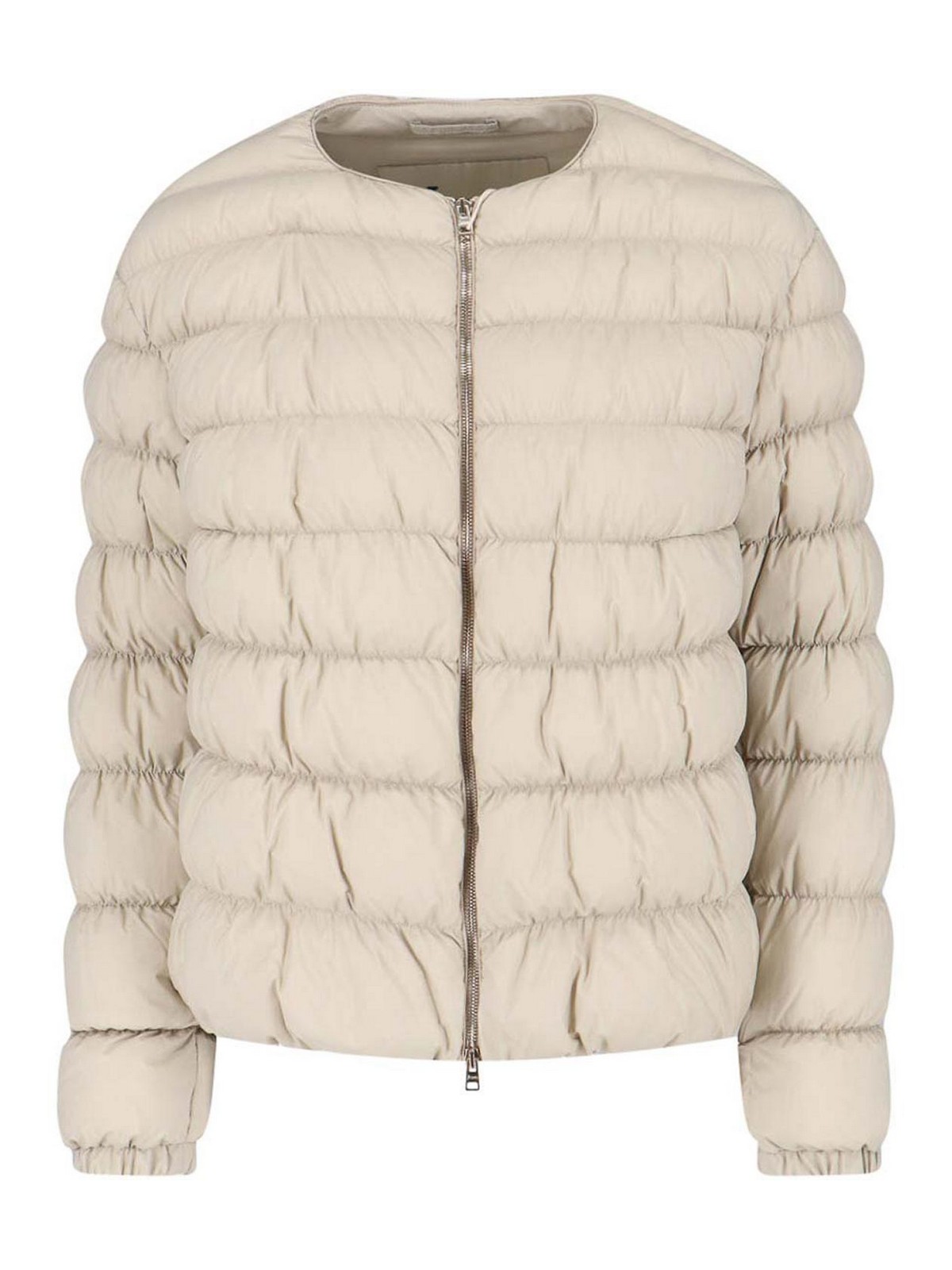 Herno zip down jacket in cream fabric, crew neck, long sleeves, zip closure, back golden metal logo tag, elasticated finishes, straight hem.