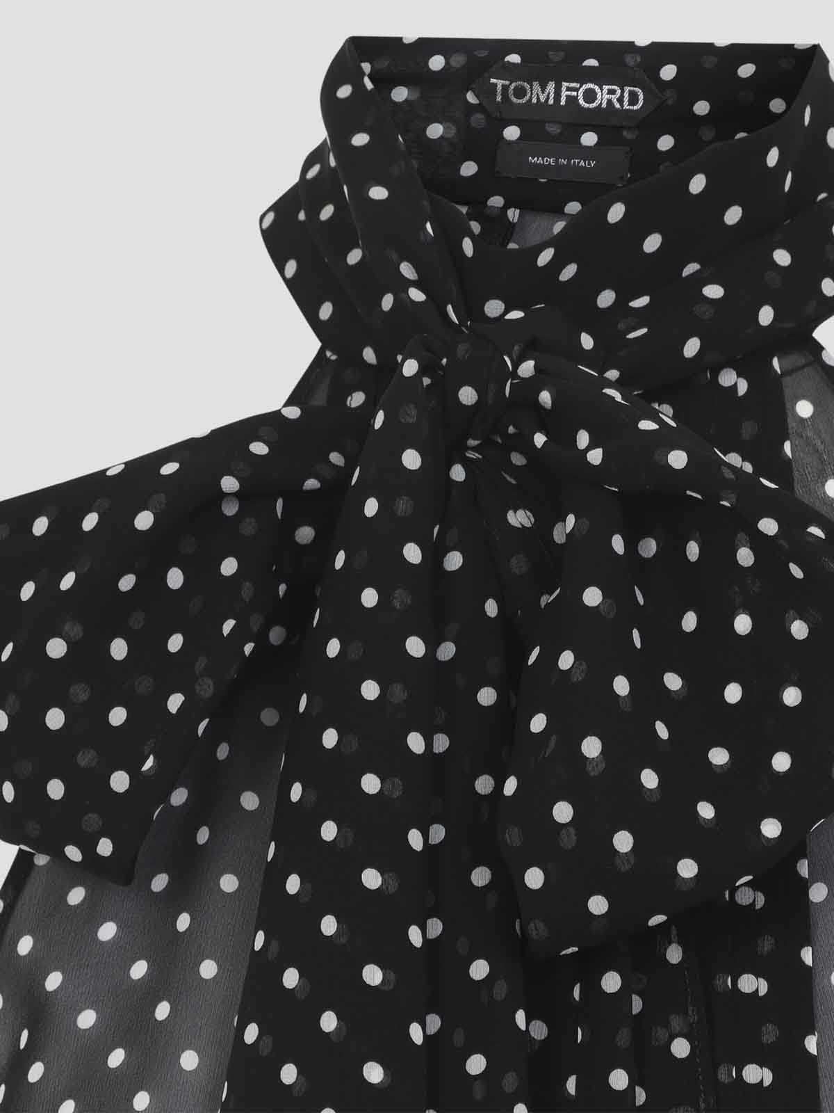 Tom ford polka dot black silk top. a lavallier top crafted from semi-sheer pure black silk with an all-over polka-dot pattern. it features a standing collar, a pleated plastron on the front, and a slightly flared hem.