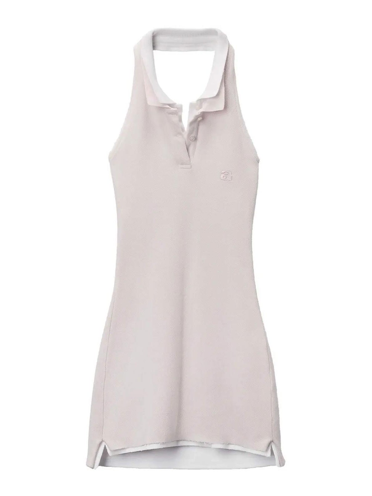 Collared, sleeveless, short front buttoning, halterneck, and above-the-knee length. composition 91% cotton, 7% polyamide, 2% elastane