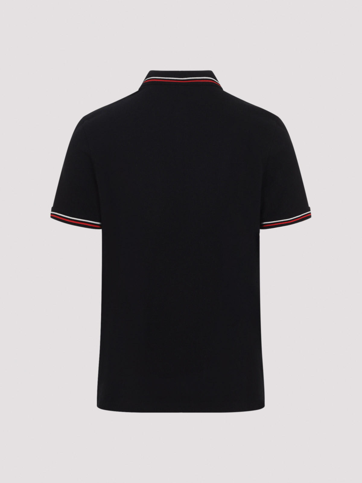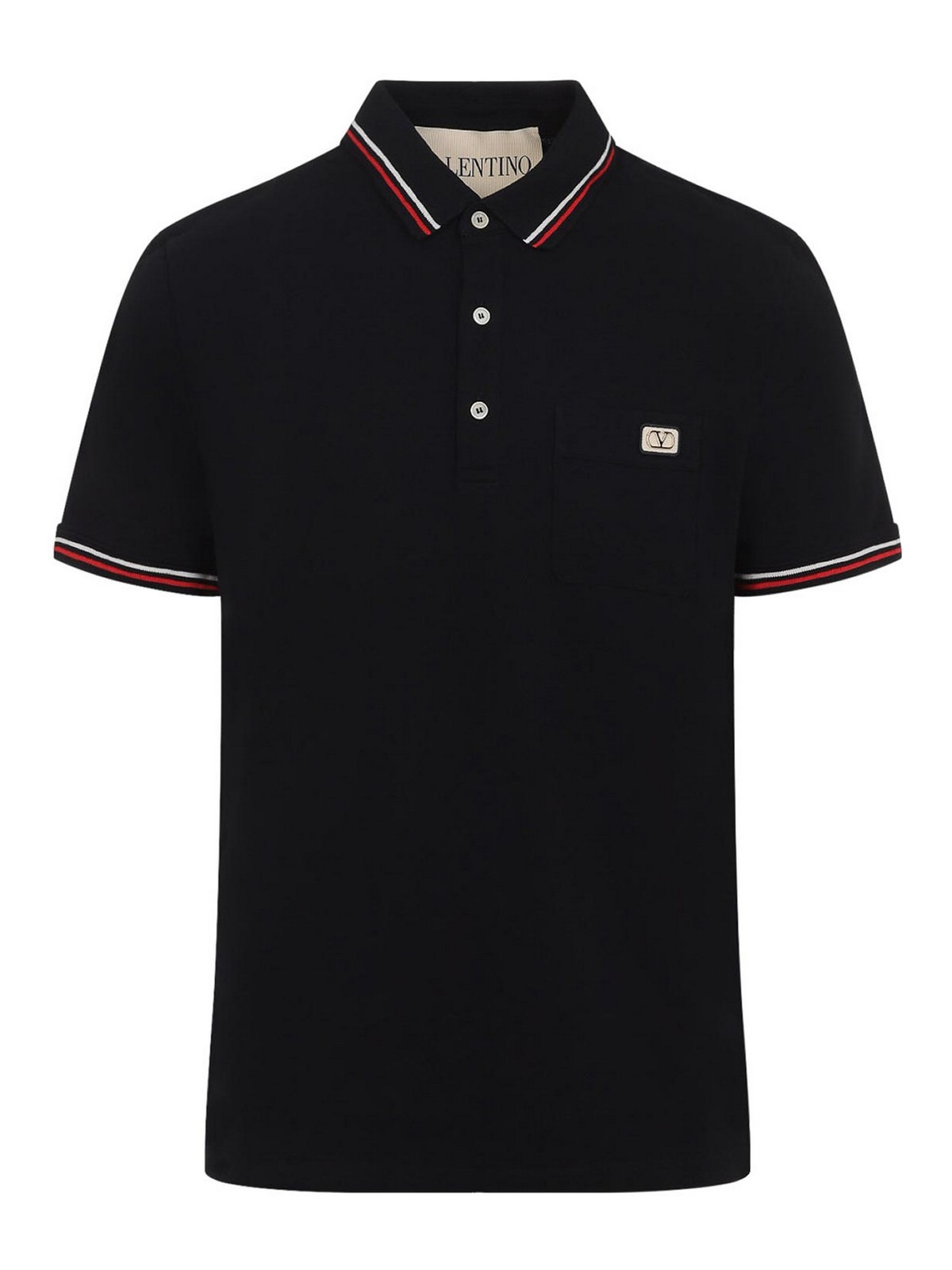 Valentino black cotton polo. pure black cotton polo t-shirt, classic polo collar, chest patch logo with signature gold-tone metallic v logo detail, short sleeves, straight hem, white and red stripe details on the collar and on the edges.