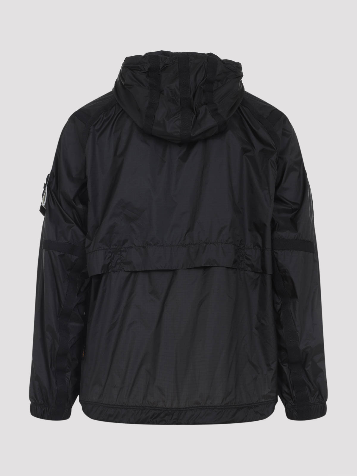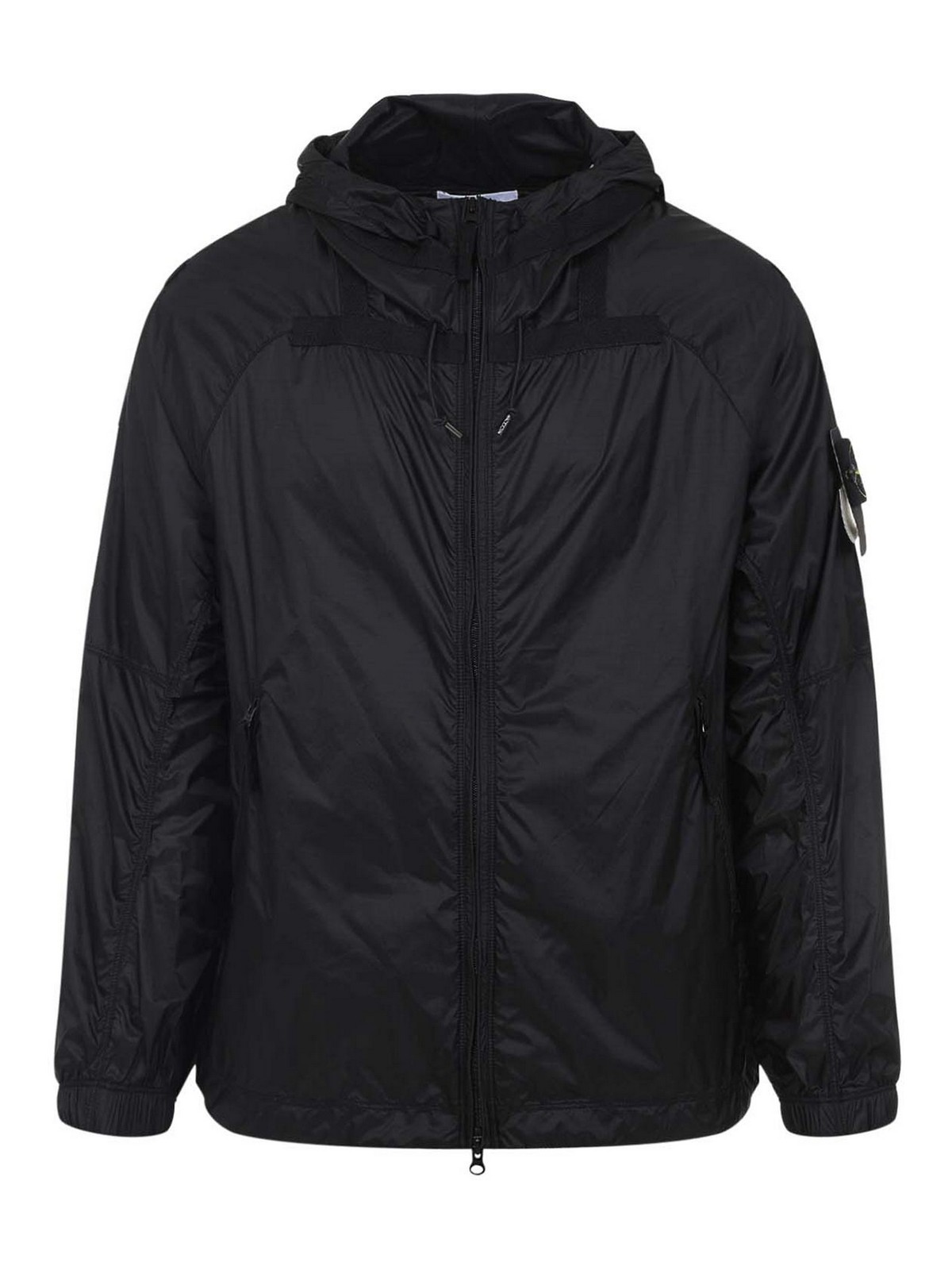 Stone island black polyamide jacket. crafted from black nylon ripstop, hood with drawstring, reflective details, two-way zip fastening on the front, raglan long sleeves, logo patch detail on the sleeve, elastic cuffs, two front zip pockets, hidden drawstring at the hem, inner pockets.